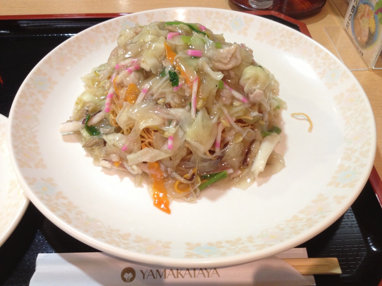 注文してでてくると、まさに同じものであった。皿の大きさだけではなく、量にも驚いた。これは焼きそばというより、長崎の皿うどんだ。イカと豚肉、玉ねぎ、白菜、かまぼこなどがチャンポンのスープで餡にしてある。