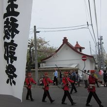 2013年は、まだ桜が咲き誇る5月18日と19日の土日に開催されました。祭りではパレードや土方コンテスト、大砲射撃などがあります。市内パレードでは地元の高校などのブラスバンド演奏やチャンバラの果し合いなどがありました。皆、幕末の衣装に仮装しています。官軍や新撰組が勇壮に行進しますが、その実態は地元に事務所のある企業や銀行の有志の方…。パレードは市中から五稜郭に入り、箱館奉行所裏の広場(特設会場)でブラスバンド演奏や大砲射撃などが行われます。皆、パレードの列と並んで会場へぞろぞろとついていきました。大砲射撃は轟音がとどろき、一番の見所だったような気がします。パレードで曳いていた大砲はただのはりぼてではなかったのですね。