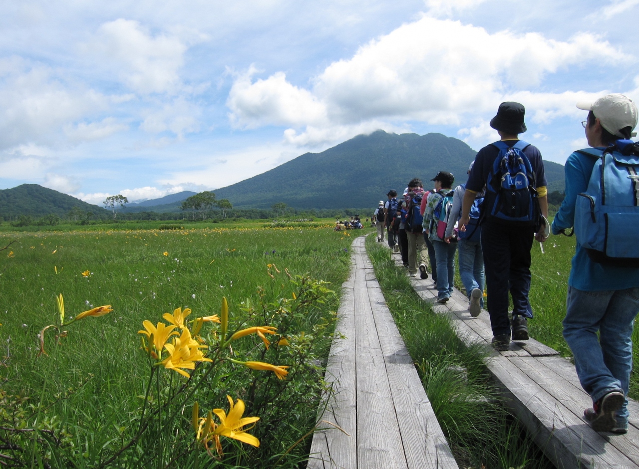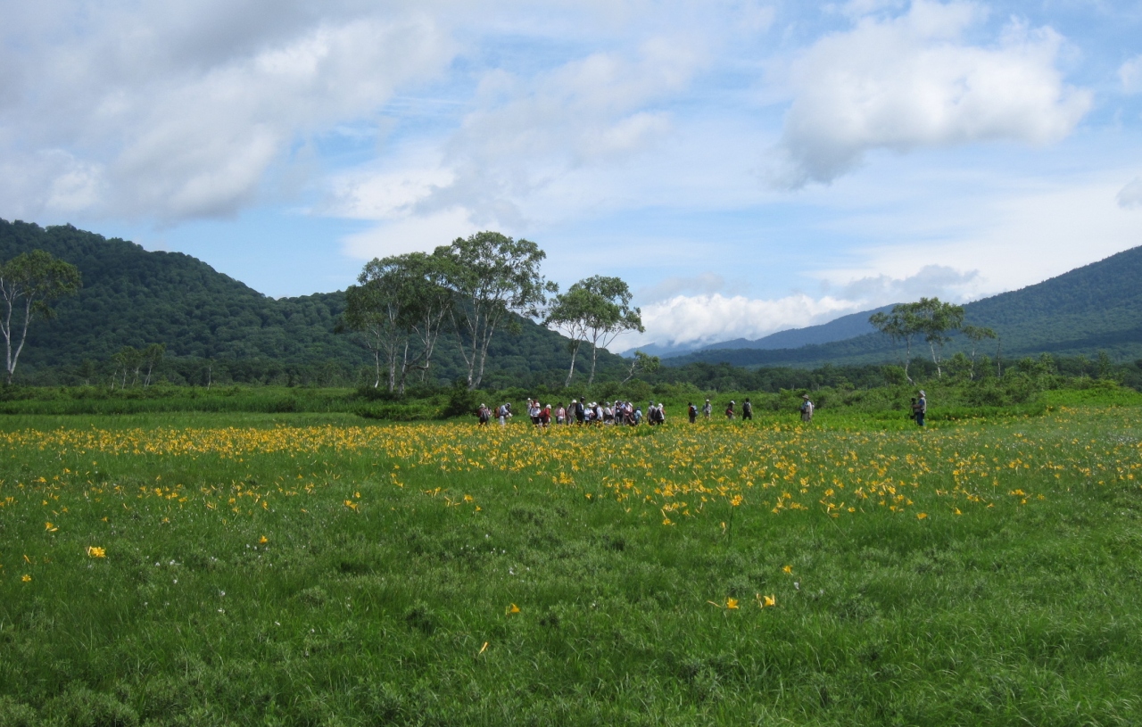 黄色い帯状の「ニッコウキスゲ」の群生が見れた。
