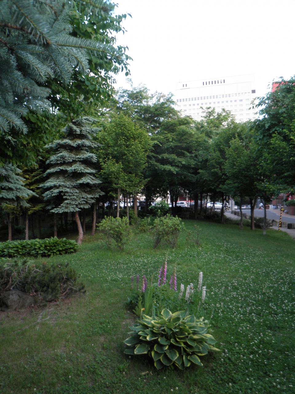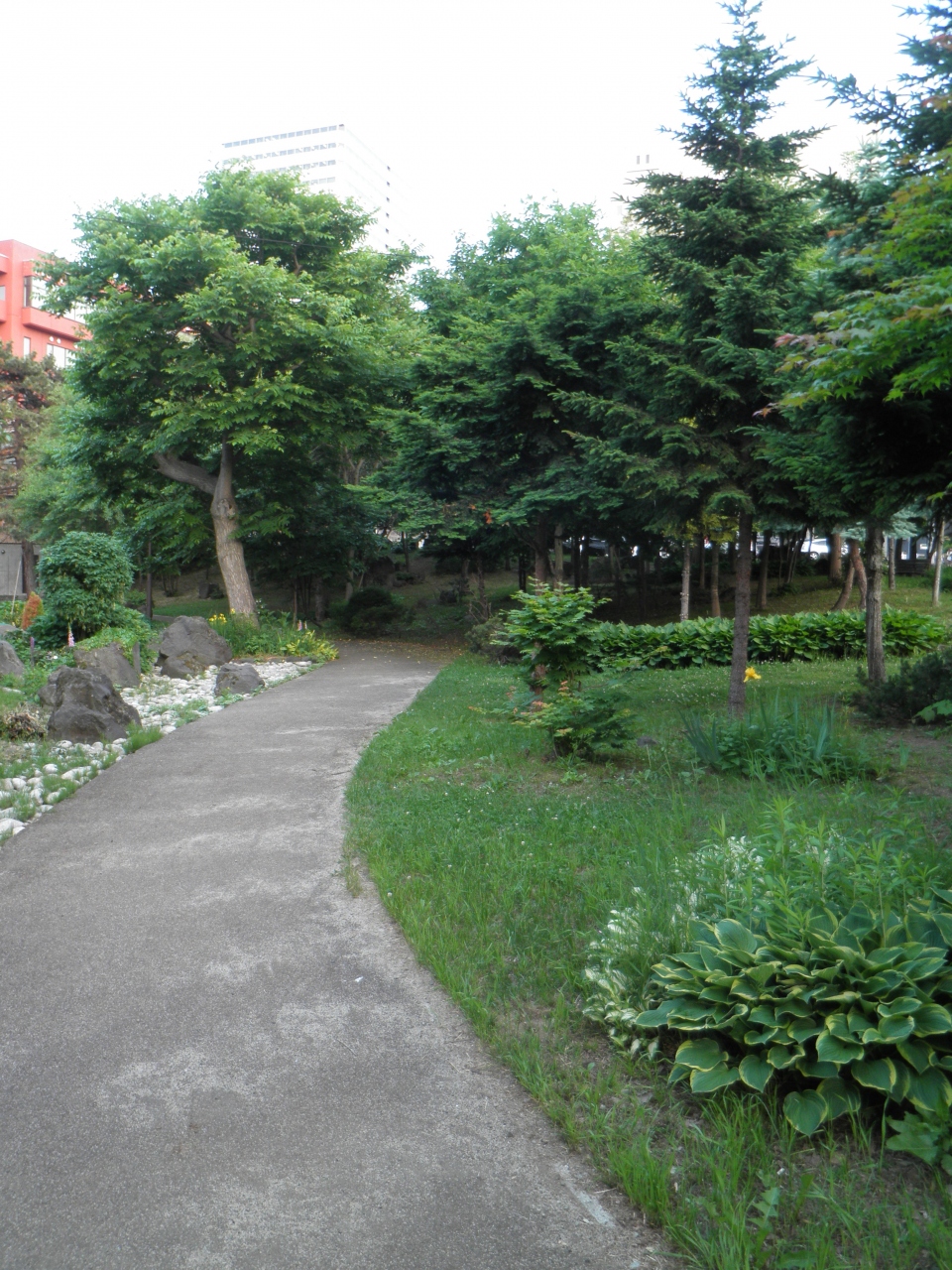 札幌駅の西側にある偕楽園緑地は、細長い緑地で花や木が植えられています。 クラーク像がある北海道大学からは歩いていける距離ですが、あまり知られていないせいか、訪れるひとは少ないようです。 石川啄木の歌碑や清華亭などがあり、少し北側に傾いた傾斜地になっています。