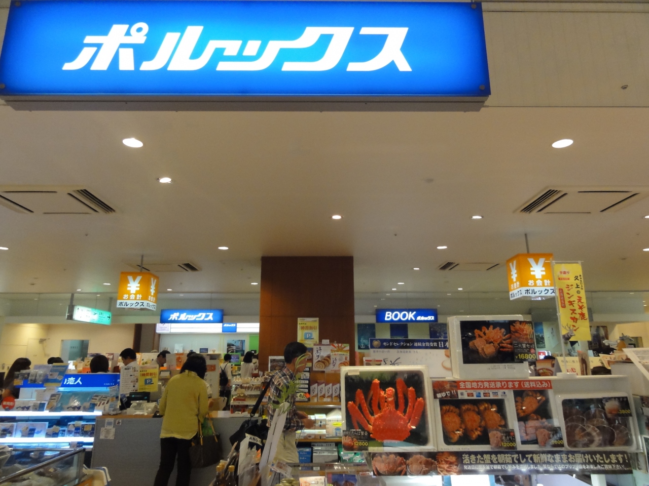 空港の2階の売店で一番大きなお店がポルックスです。リンゴやブルーベリーのワイン、独特のしばれワインに日本酒、土方歳三ラベルの商品もありました。スープにすると美味しい南瓜やじゃが芋、人参などの粉末フリーズドライ製品、価格は高いのかも知れませんが、大きなメロンやアスパラ、冷凍の蟹など生ものもありました。函館のお菓子コーナーの隣には、小樽ルタオのチーズケーキもあり、食品関係の品揃えはかなり充実してます。