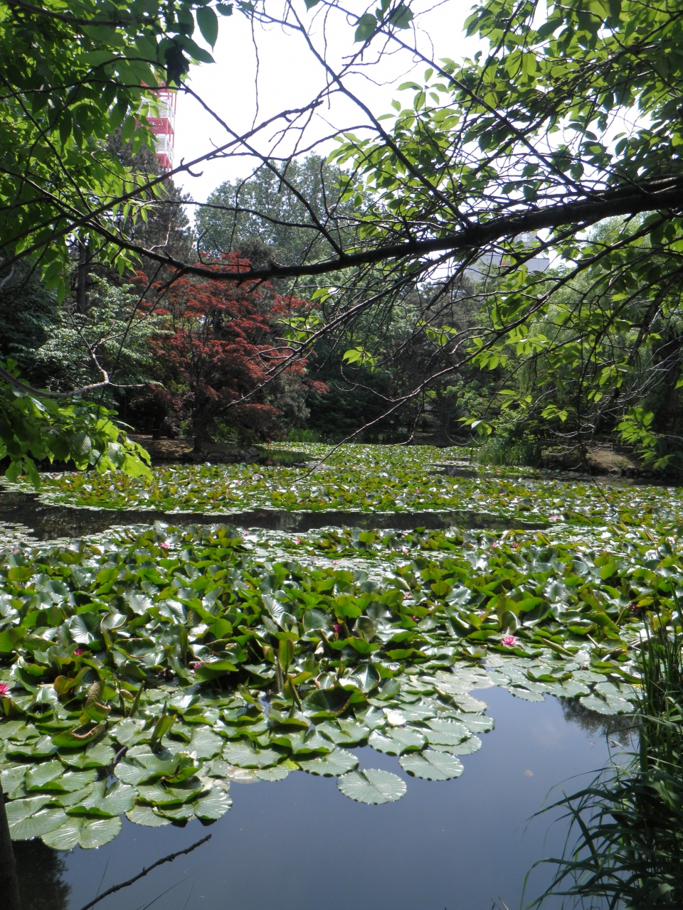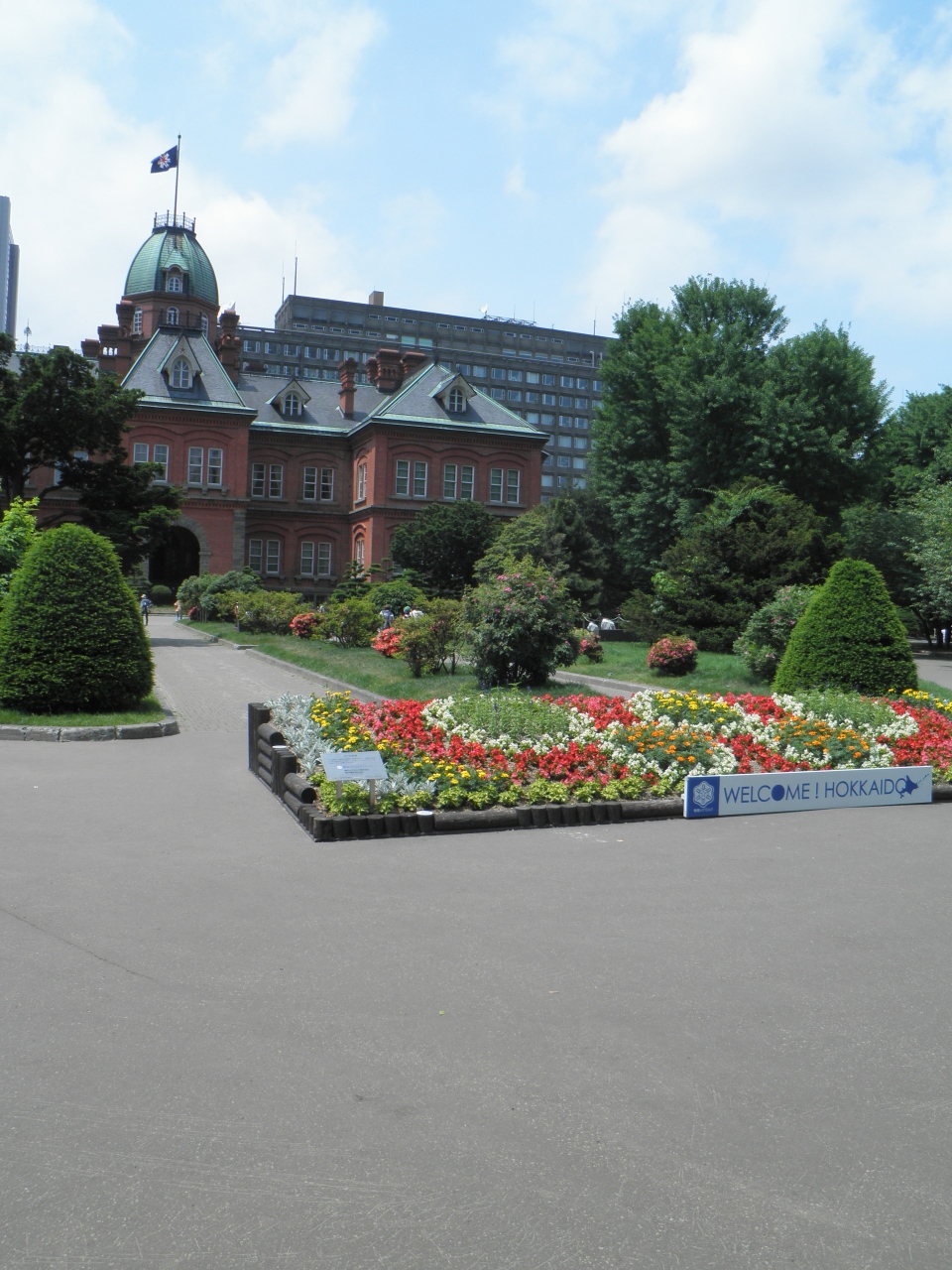 旧北海道道庁の建物は赤レンガの愛称でよばれて親しまれています。 ここは観光客が多く訪れるので、建物の前にきれいな花壇が設けられていて「Welocome! Hokkaido」の看板が置かれて記念写真スポットになっています。 また、前庭の池はハスの葉がびっしり覆っていました。