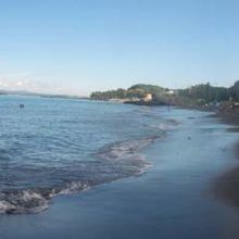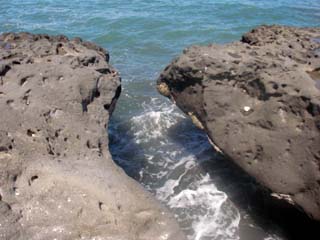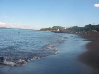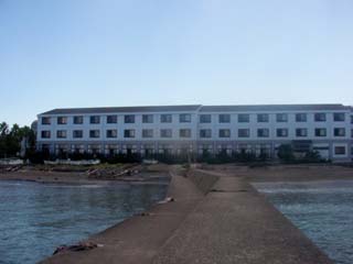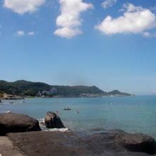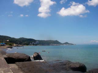 西岬のバス停で下車して海岸に出ると、館山湾の海岸が広がっています。北側には鋸山から続く内房の海岸が続き、反対側が西岬に向かって渚が続いていて、岩場を越えると館山休暇村があり、正面には防波堤が伸びて小さな漁港があります。