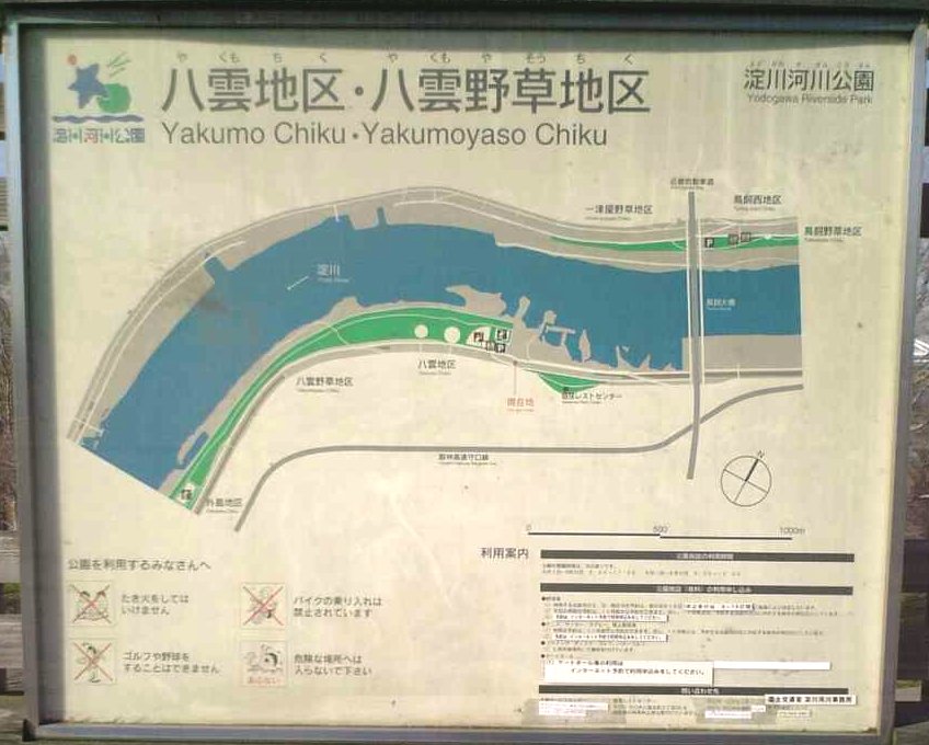車は、国道1号から鳥飼大橋方面へ淀川堤防上を左折(下流方面 )駐車場へ入る。帰りは大日方面へは右折できませんのでグルっと回っる必要があります。公園には、少年野球場が1面、テニスコート人工芝コート3面、芝生広場があります。だだ駐車場は、34台と少ないのが難点。