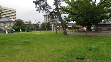 別府駅東口から徒歩10分位で着きます♪バリアフリーをテーマに作られたそうで車いすでもベビーカーでもキャリーを引いてても楽々移動できます。園内にはトイレ、ベンチ、遊具、芝生、更にすぐわきには100円温泉もありとっても便利です(*^_^*)私たちは、高速バスと別府駅をよく利用するのでその移動の間に、お弁当を食べたりちょっと温泉で一休みしたりして利用してます♪
