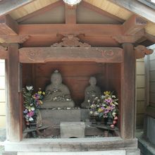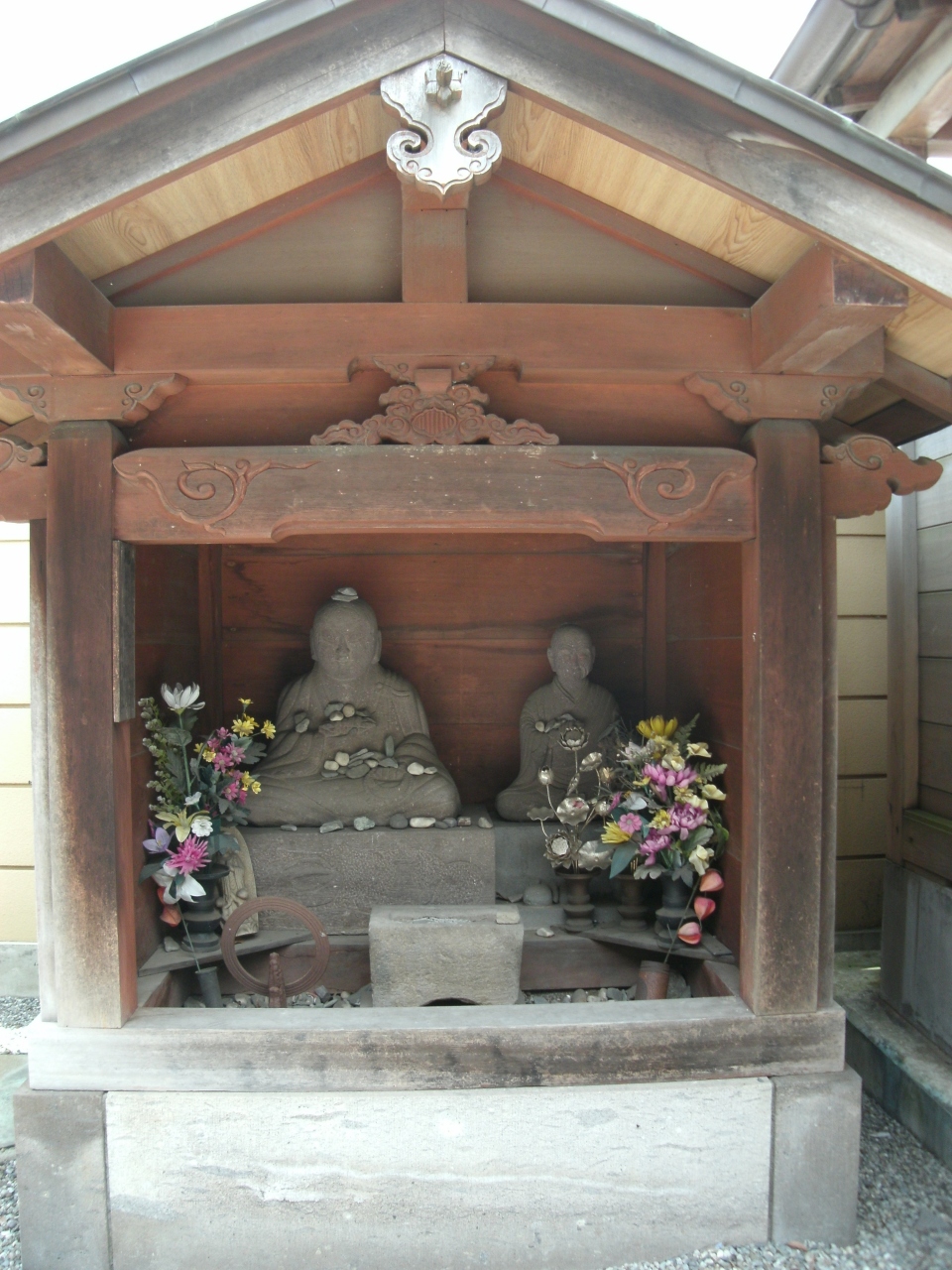旧東海道の伊勢山橋、下を小田急江ノ島線が走るところ、小高い上に風早山・真源寺があります。浄土宗のお寺です。石段登り、門を入ると左手に小堂があり、2体の弘法大師像が安置されています。よくみると土台まわりにある小石が大師さまの頭や手や足元などに置かれていました。何かの御利益?・・お寺さんに聞かないとわかりませんが。ご存知なら教えてください。