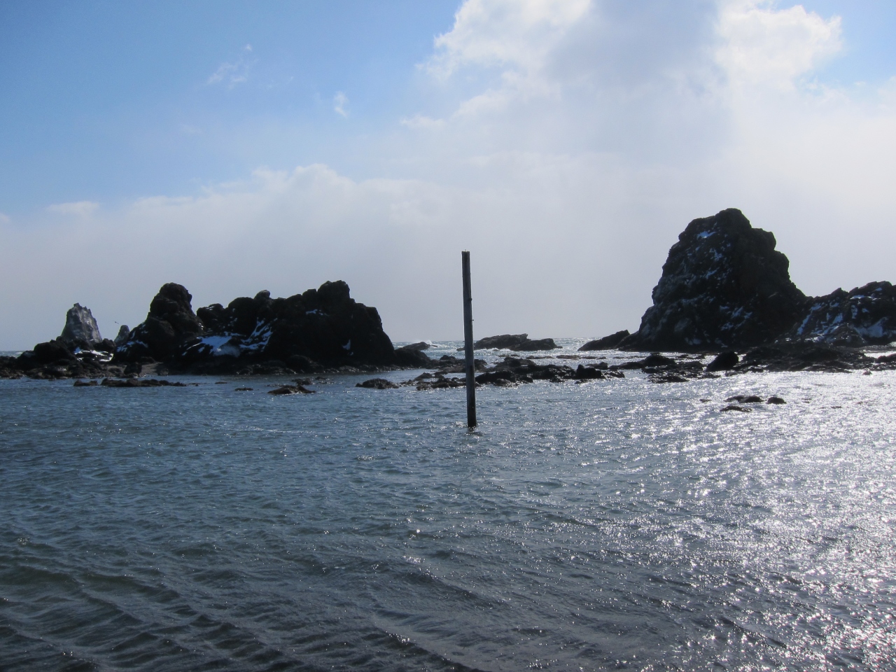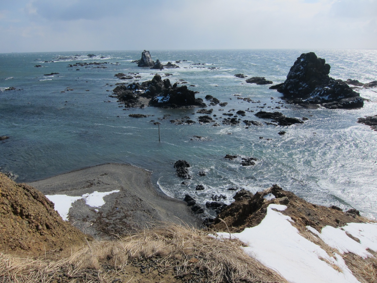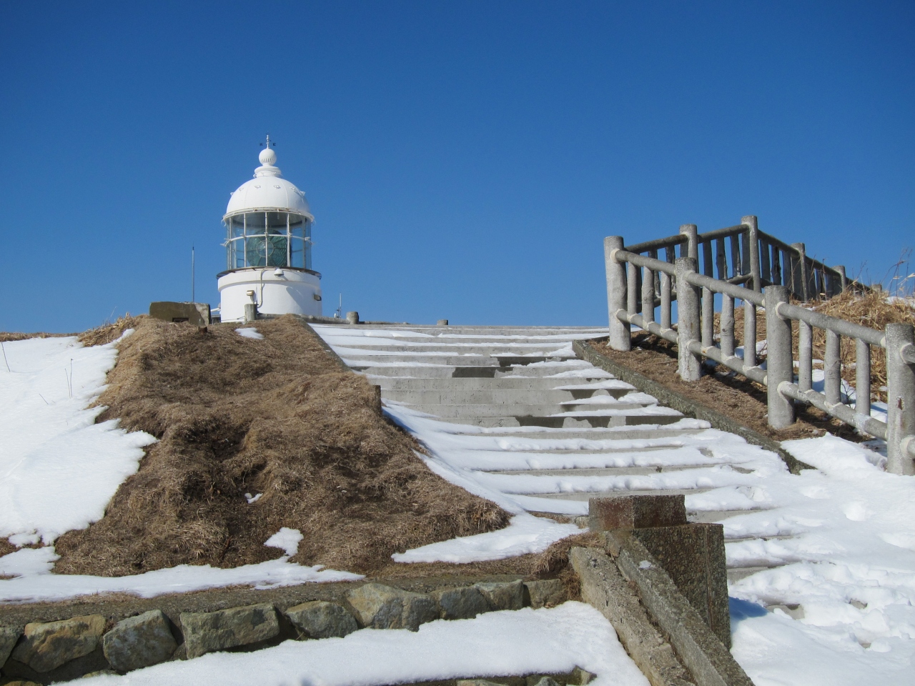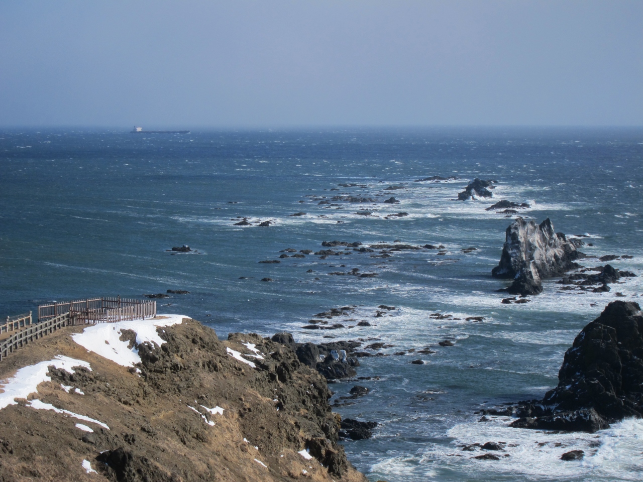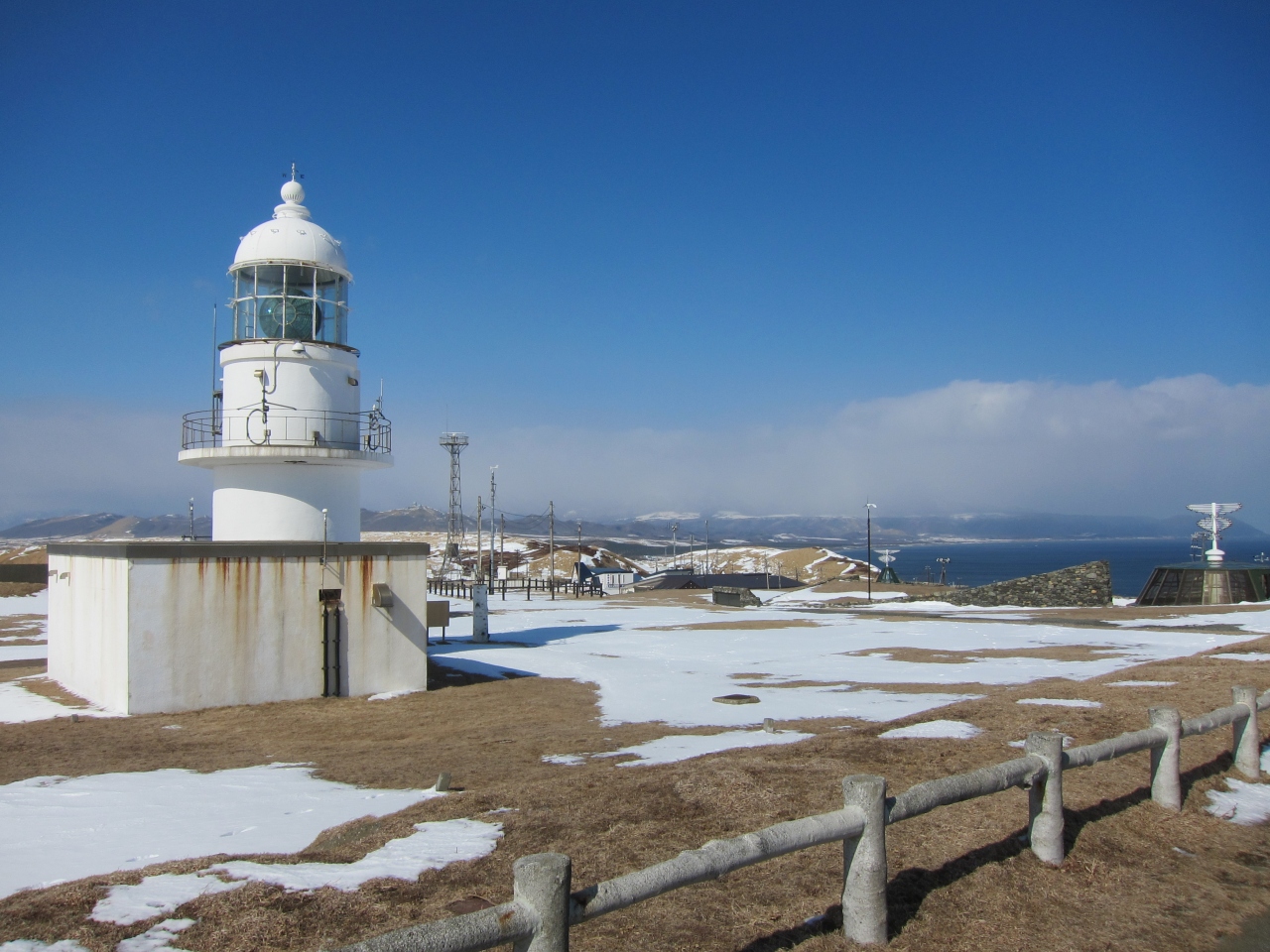 襟裳岬の先端の高台の上にある灯台です。すぐ前は展望台になっていて日高山脈が海中へと落ち込んでいく雄大なパノラマが楽しめます。そんな景色とは裏腹に付近は海流が早く、海中まで岩礁がそびえる海の難所。ましてや風の名所でもあり、レーダーやGPSなど位置確認の手段の発達した現代でも灯台の役割は大きいと思います。海流の速さは展望台を下りて波打ち際までいってみると実感できます。岬の先端では、ほんの浜辺から1~2mのところなのにまるで川の流れのように海水が流れていきます。いままでこんな浜に近いところで海流のあるところなど見たこともありませんでした。