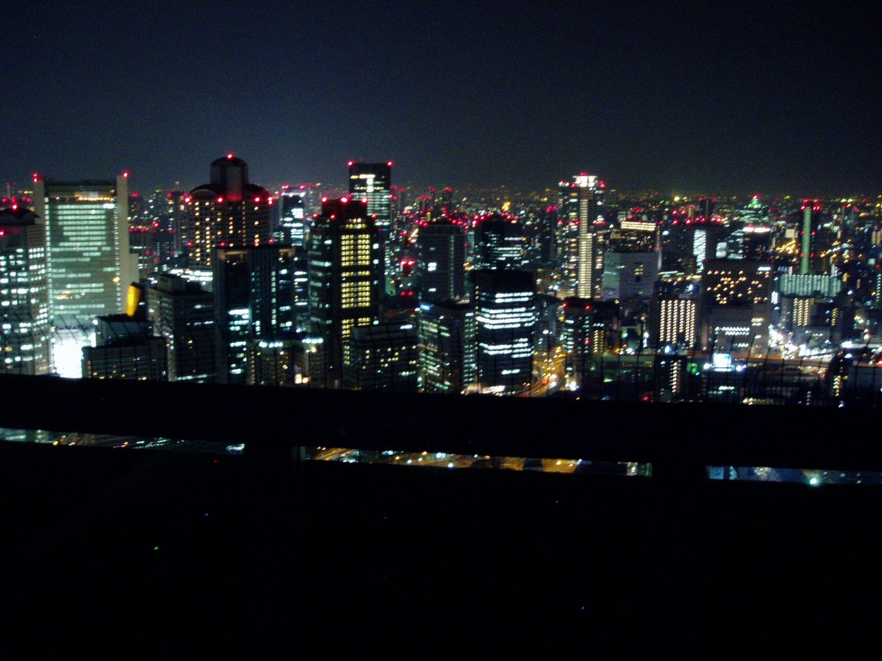 大阪駅から北にむかい貨物ターミナルの下の長い地下道をくぐると梅田スカイビルに出ます。このビルは連結超高層ビルというのか 不思議な形をしています。その連結部分が下から見ると丸い穴が開いたようになって 穴の内側から2本の通路(エスカレーター)が斜め下に伸びています。大阪行くたびに この不思議なビルが気になったいました。そこで今回初めて上まで行ってみることにしました。高さ173m連結部分が円形の展望スペースになっています。そのため 360度ぐるりと展望できます。確かにきれいでした、夜景が。でも家族で来ているのは私たちくらい あとはみなカップルでした。場違いと感じ早々下りてきました。