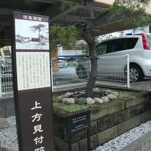 東海道京都よりに位置する上方見附には松が植えられています。ココ、戸塚宿上方見附跡の史跡にも小さいながら松が植えられていました。ところは大坂下バス停、サイゼリアの前(駐車場)。解説板と銘板の浮世絵があります。広重の戸塚宿浮世絵は区制50周年記念で建てられたもの。当時の様子うかがうことできるとの解説ありますが、ちょっと剥げ欠けているようでした(見た目)。道路反対側には跡地盾があります。