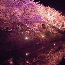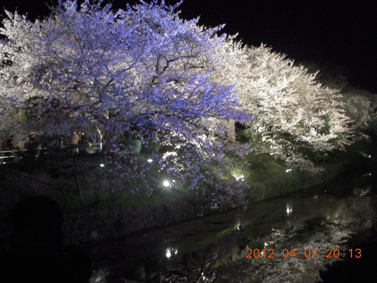 ライトアップされた桜が美しいと聞き、福岡城跡に花見にでかけました。大濠公園側から歩いていったのですが、途中屋台が出ていたりと花見気分が盛り上がります。裁判所近くのお堀までいくとお目当ての桜が咲いていました。ライトアップされた桜は、青系や、白系のライトに時間を変えて照らし出されてきれいな夜桜が堪能できました。