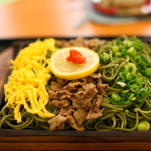 瓦で焼けた茶そばがおいしい。見た目もカラフルで楽しい。