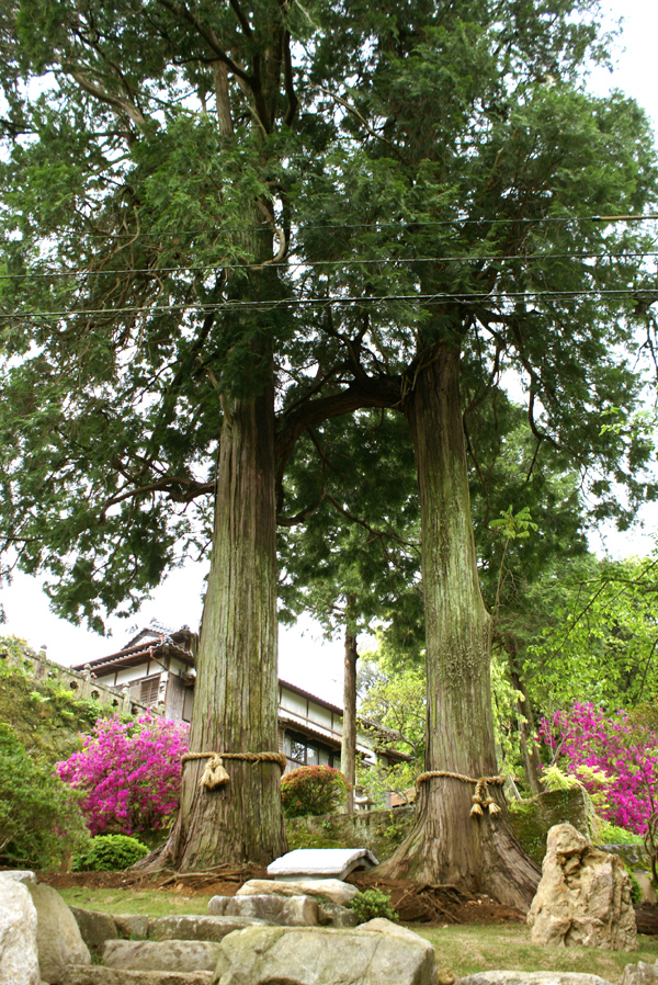 参道には立派な夫婦杉もあり、苔むした石垣など、近づくほどに