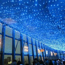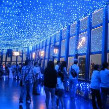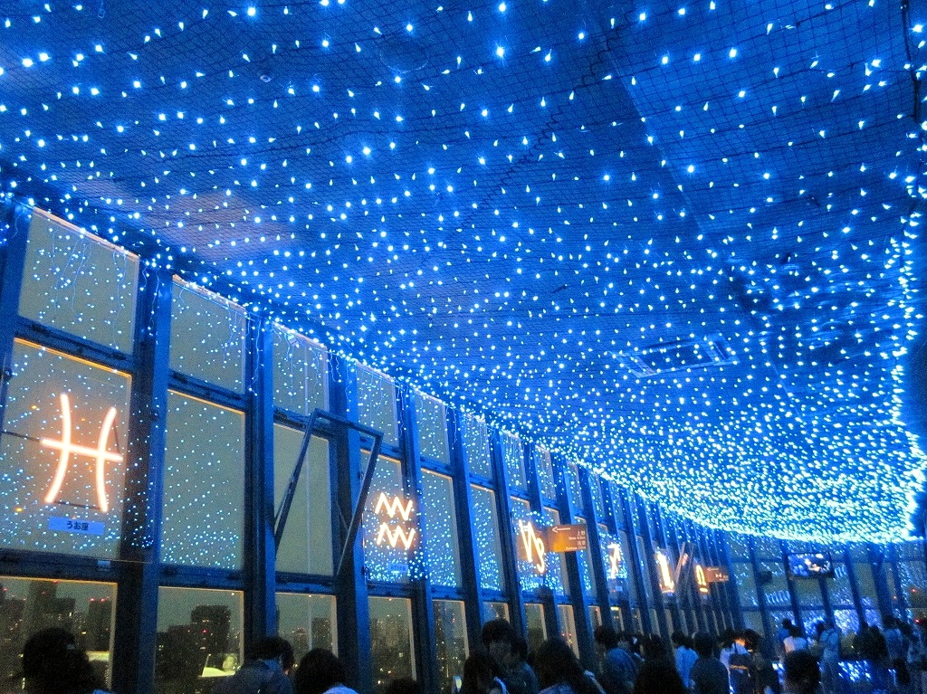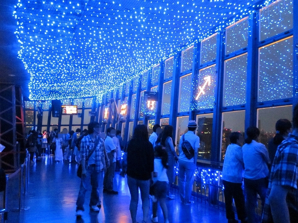 大展望台1階の天井に「天の川」に見立てた青色のイルミネーションが点灯されるイベントで、外からでも大展望台の下半分が青く光っているのがわかります。