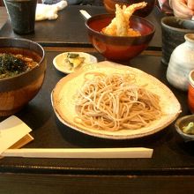 私が注文したのは「渡月膳」。半量のざるそばと半量のそば(冷・温と山菜・とろろは選択)と小天丼に香の物で1785円。