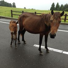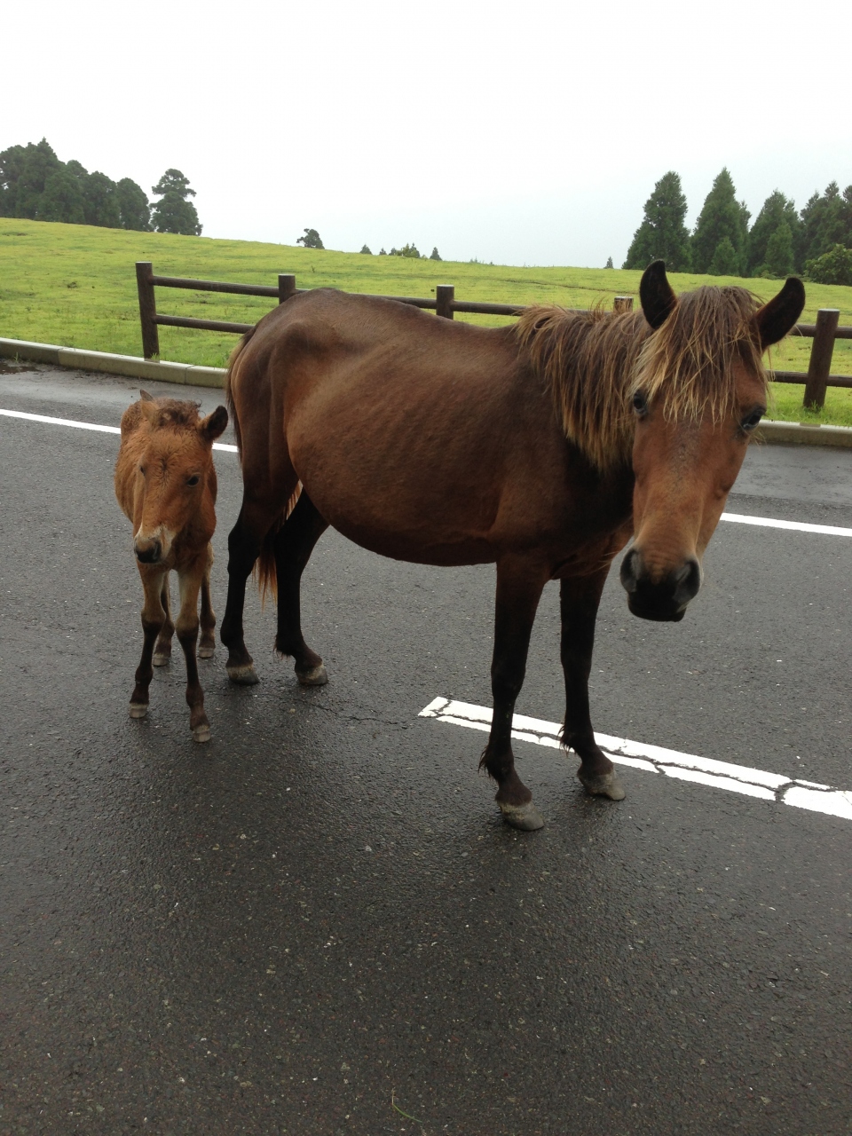 色んな場所に野生の御崎馬が草を食べていました。道路も全く平気なようで本当に物怖じしない馬です。