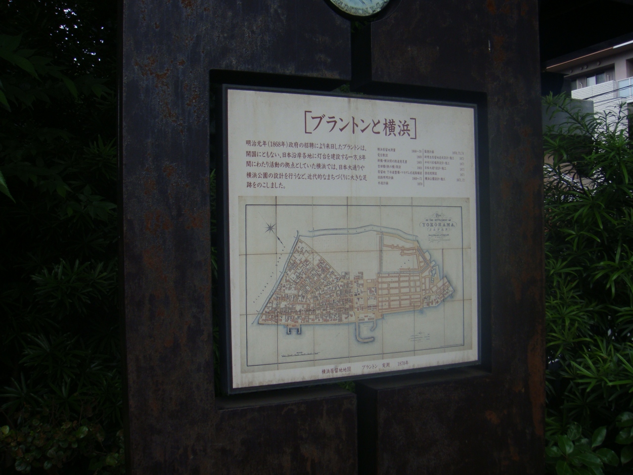 明治2年、英国人土木技師ブラントンにより吉田橋は日本初のトラス鉄橋として架け替えられました。日本 最初のトラス鉄橋であり、「鉄の橋」として市民に親しまれるとともに、文明開化のシンボルとして、錦絵にも描かれてます。現在その吉田橋の袂に「ブラントンと横浜」碑がありますが、橋の下は川ではなく高速道路になってます。
