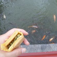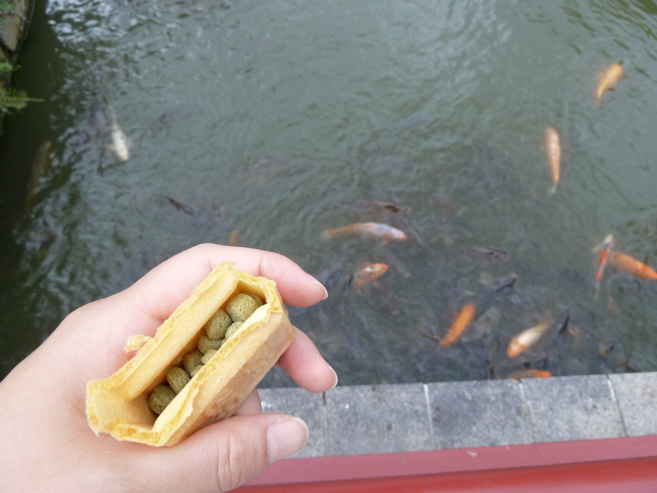 池にはコイもいて、100円のガチャガチャでエサが買えます。