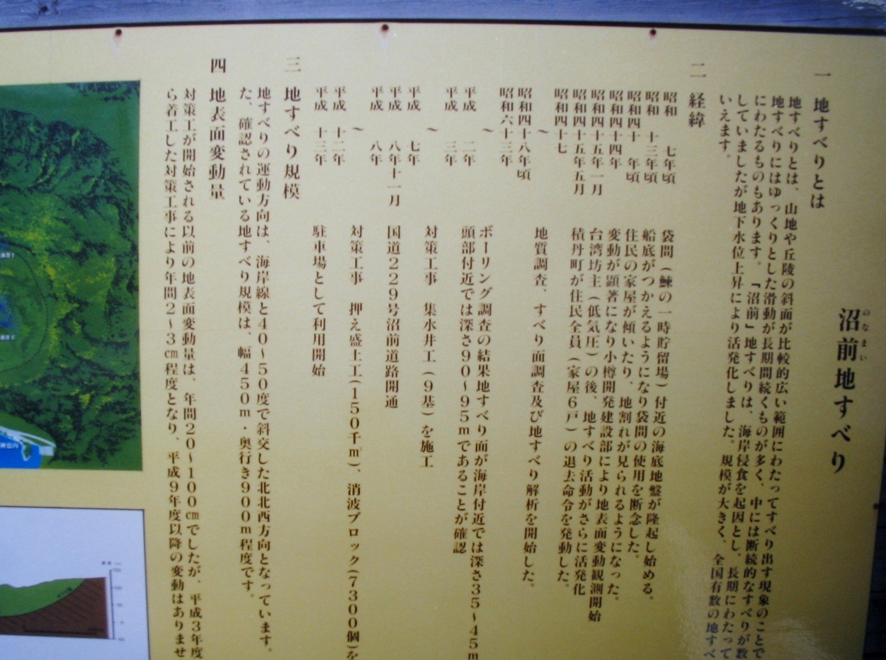 神威岬から5kmほど南の積丹トンネルの北側にトイレの完備された比較的大きな駐車場(沼前地滑り駐車場)があります。この付近に大規模地すべり地形があります。地すべり地形とは、その名のとおり大地がすべり動いて出来た地形のことです。中央部の幅450mほどの部分は最近まで動いていて、海岸浸食と地下水の水位上昇で、年間20~100cmのゆっくりした地すべりが観測されているそうです。