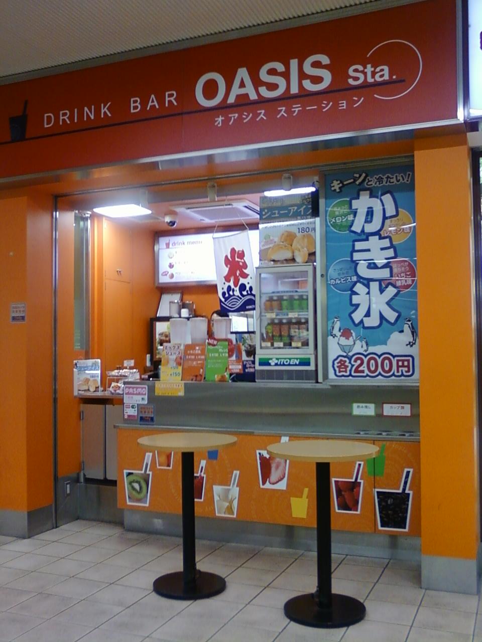 ここのオアシス・ステーションは、小田急小田原線海老名駅の階段すぐ脇、小田急線改札内の化粧室の近くにあります。駅の周囲にあるカフェやファストフード系の店は少なくとも二、三分は歩かなければならず、とても重宝しています。特に夏場の夕方などは人が並んでいます。かき氷もあります。