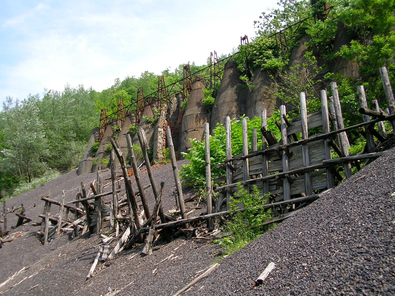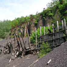 「上国(中外)鉱山跡」は、上ノ国町早川地区にあった、マンガン鉱山の遺構です。昭和11年(1936年)に鉱床が発見され、中外鉱業が操業していましたが、昭和61年(1986年)5月に閉山したものです。鉱山の遺物としては、北海道の産業遺産として認定されているマンガンを精製するためのペンシル型の“焙焼炉”が山肌に並んでいるのが目を引きました。この地区には、かっては1000人以上の人が暮らしていたそうですが、閉山後は過疎化が進み、無人となり、廃校になった小中学校や民家などの廃墟が残され、当時の様子を垣間見ることができます。付近は立ち入り禁止になっているところも多いので、注意してください。