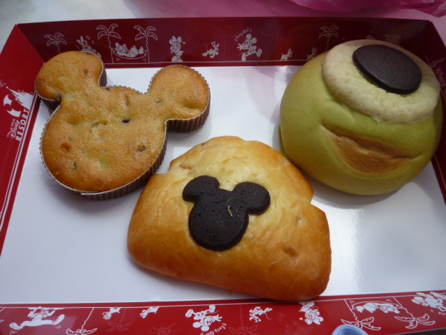 昼食に、パンとドッグを食べましたが、ディズニーの形をしたマフィンも、マイクの形をしたメロンパンも、ドッグもどれもおいしかったです。パン屋さんのように自分で取っていく仕組みになっているお店。ドッグはとてもボリュームがあっておいしかったです。