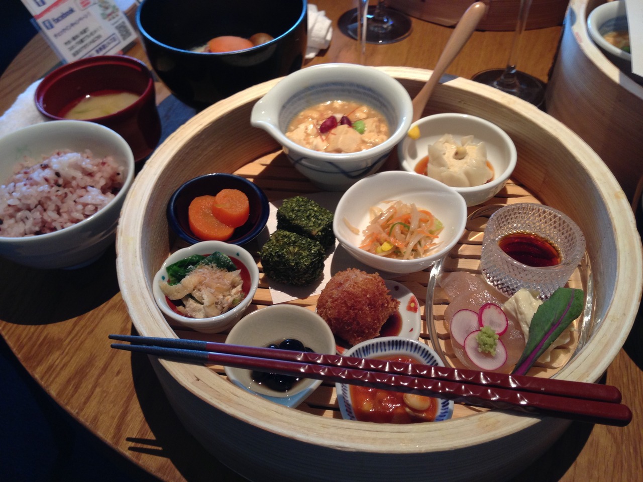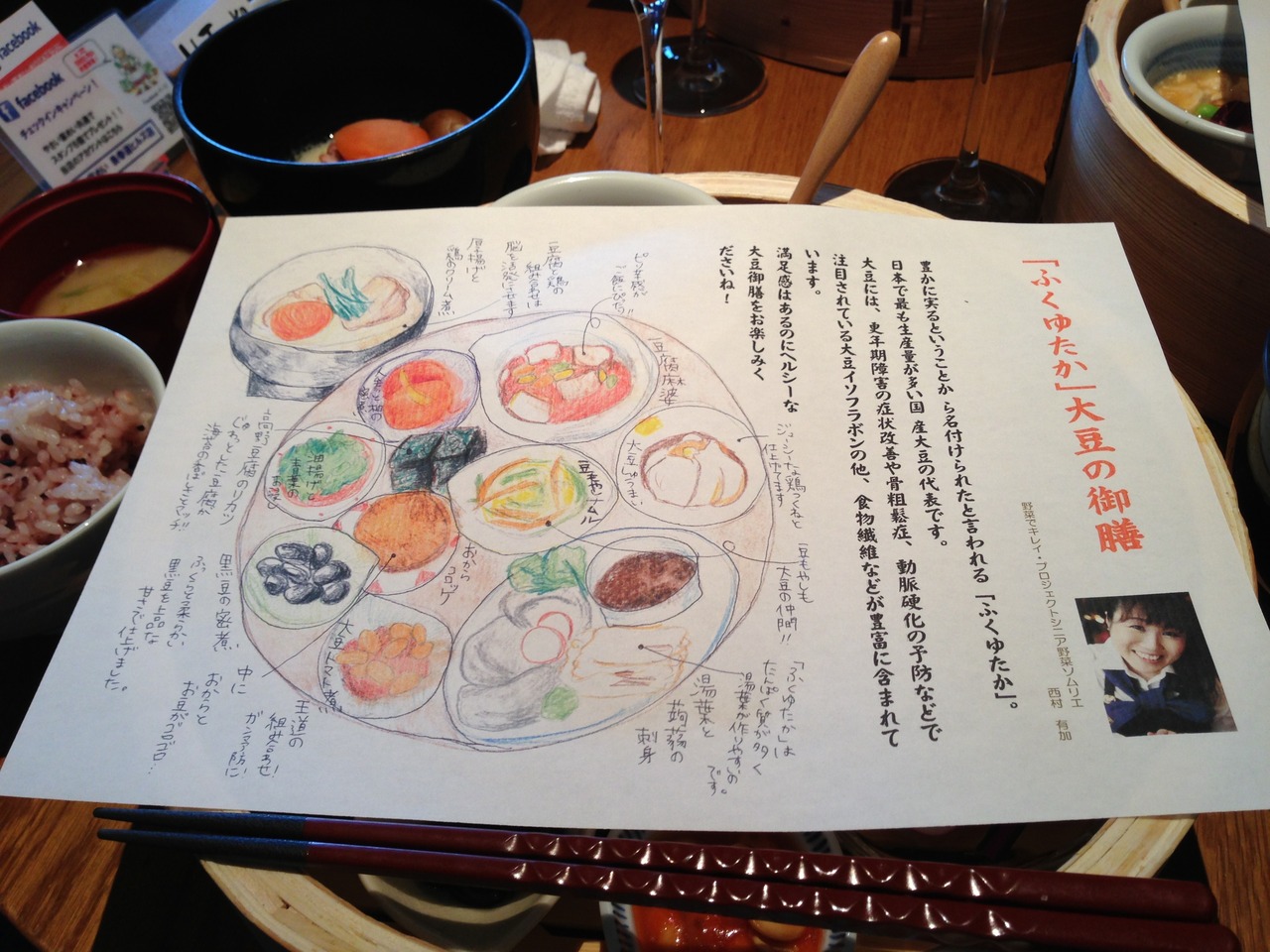 女性3人でランチしようと予約して行きました。予約だと3500円くらいのランチしか選べませんでした。日曜日の12時には店の前はすでに行列…。並ぶと他のランチメニューも選べるようです。さて、大きいせいろみたいな入れ物に、豆をテーマにした数々のお料理が入ってきました。さらに煮物とごはん、味噌汁。野菜たっぷりです。手書きのお品書きも詳しく書いてあって面白いです。最後にお茶をいただきながら長いことおしゃべりさせていただきました。ごちそうさまです。