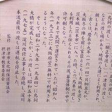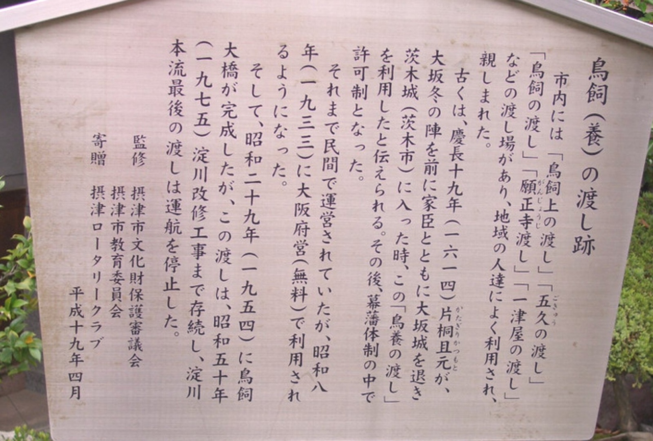 古くは慶長十九年(1614)片桐且元が、大坂冬の陣を前に家臣とともに大阪城を退き茨木城(茨木市)に入った時、この「鳥養の渡し」を利用したと伝えられるそうです。