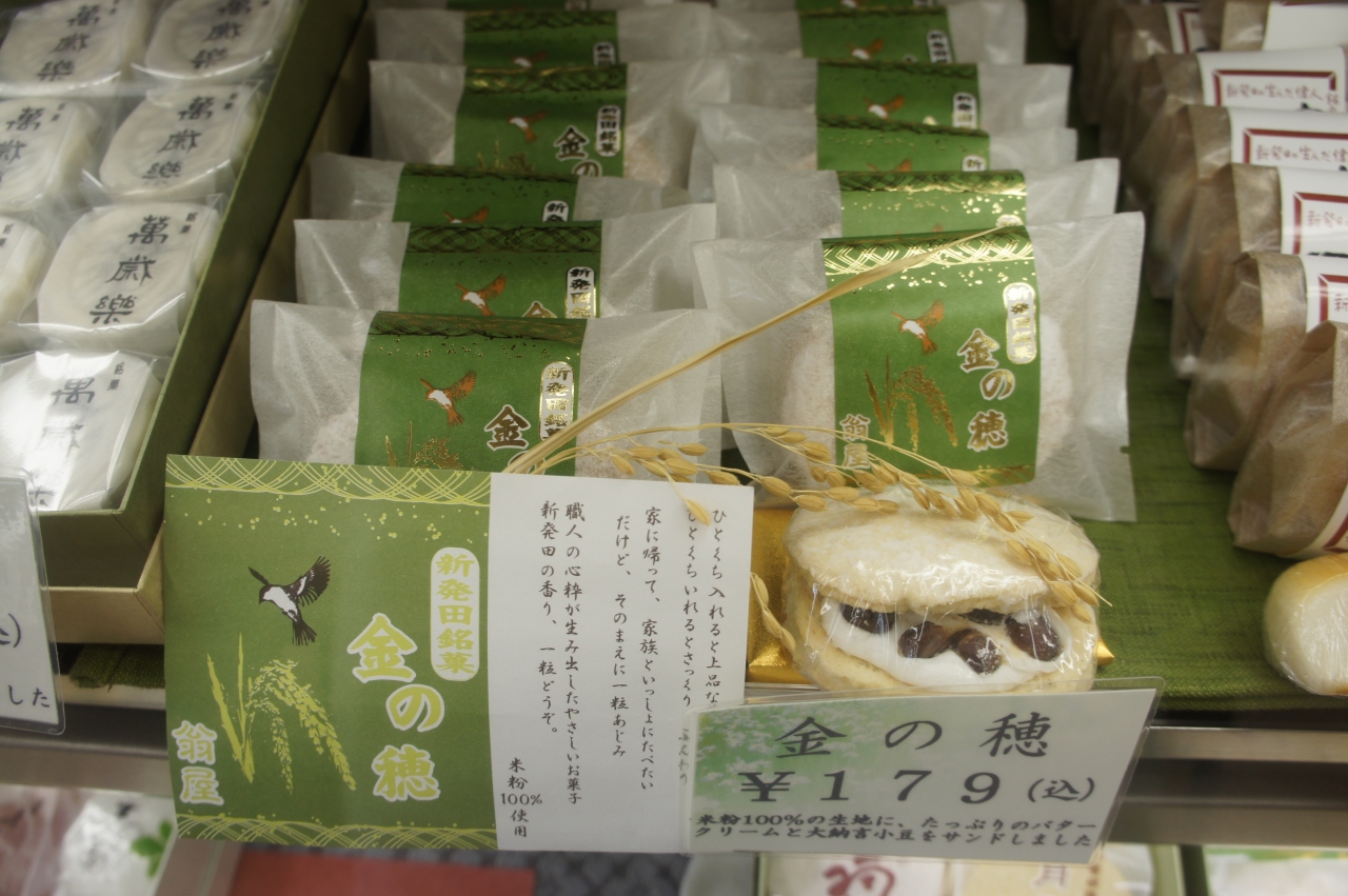 翁屋は、新発田の商店街の一角。観光地図にも載っていまして、新発田ではそれなりに老舗の和菓子屋さんのようです。いただいたのは「金の穂」。洋風のダックワースで、生クリームがけっこうしっかり入っていました。冷やしてあって、しっとりした味わいを楽しみました。