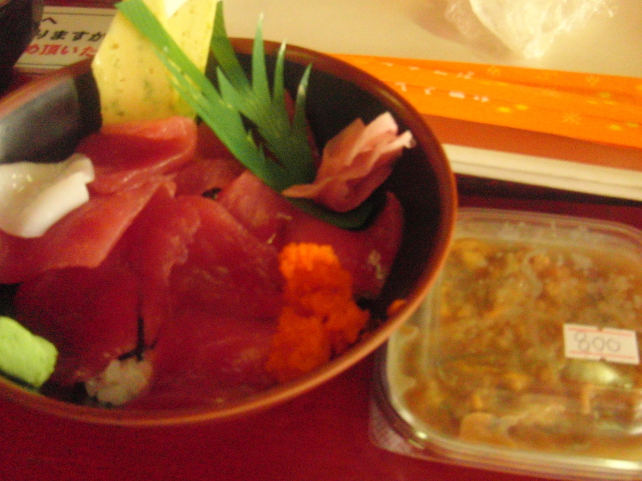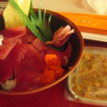 他にも、各種海鮮丼を頼んで、道の駅の中で食べられます。 丼ものにはモズクの味噌汁が付いてきました。