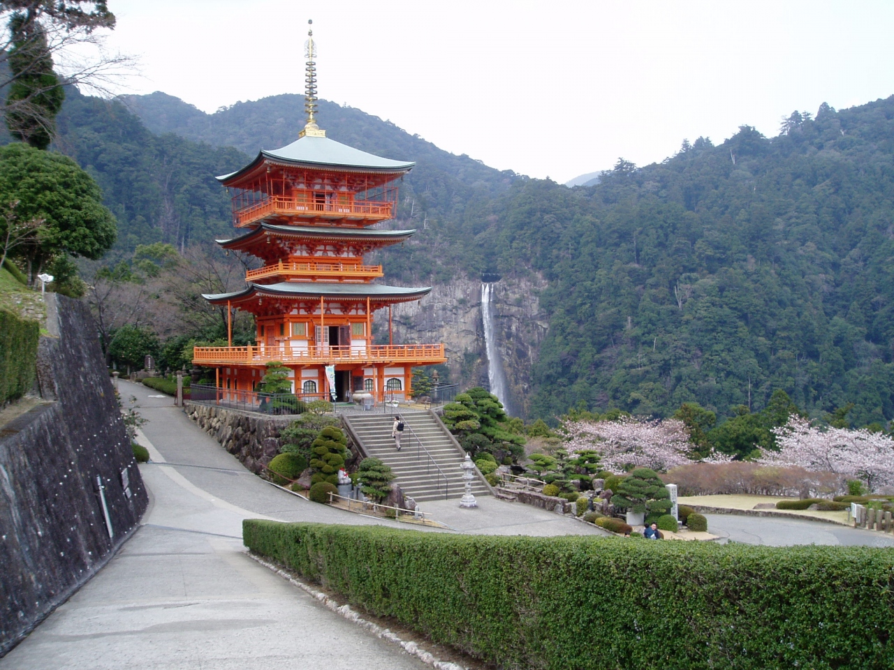 那智大社と並んであります。那智大社を参拝して歩いているといつの間にか青岸渡寺に来ていたという感じです。なんといってもお勧めは、朱色の三重塔とその後ろの那智の滝です。バランスが何とも言えません。私たちが訪れた春は、そのスポットに桜が加わります。これは、もう最高でしたよ。