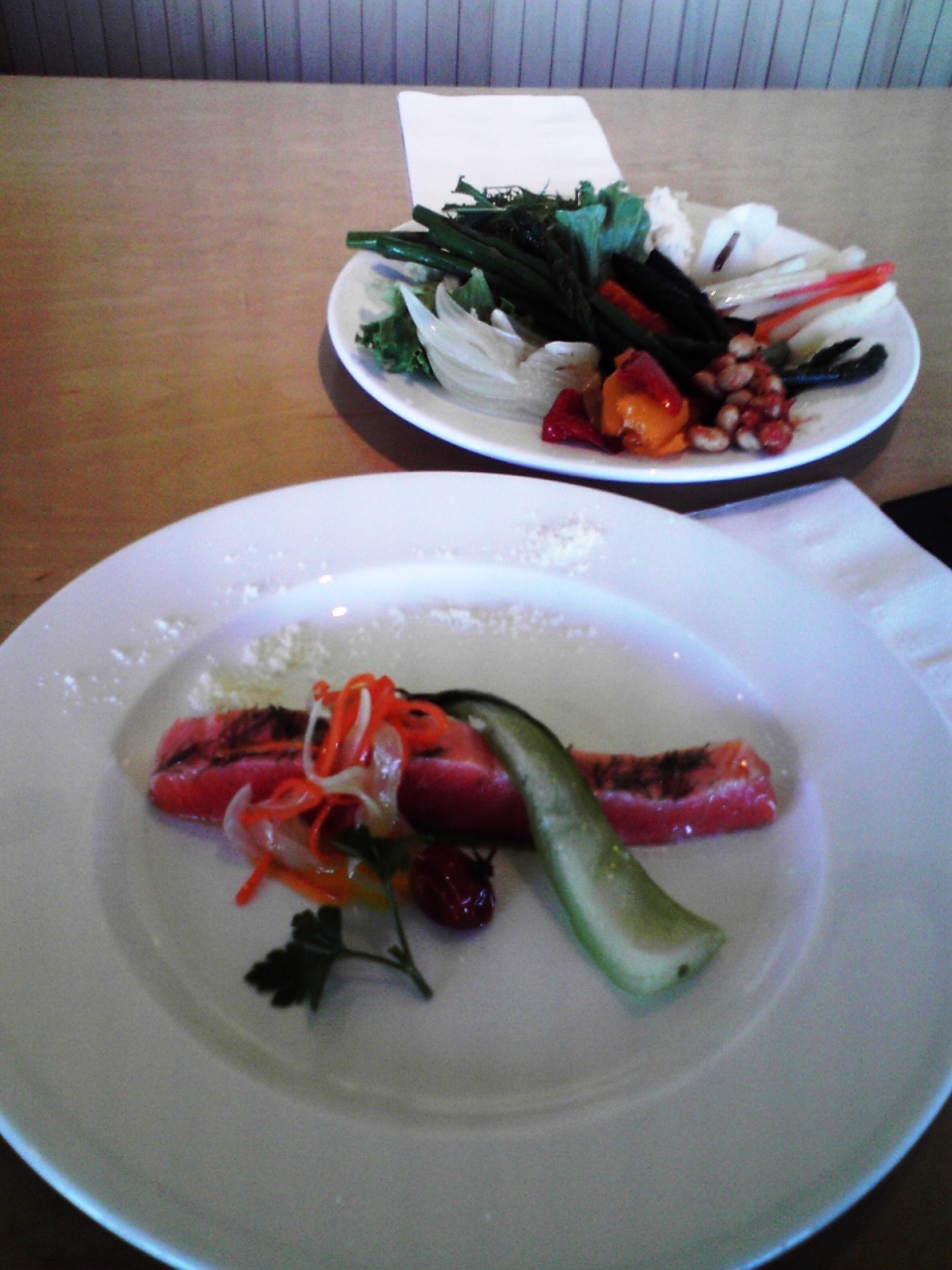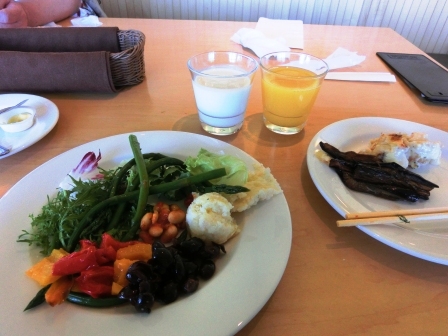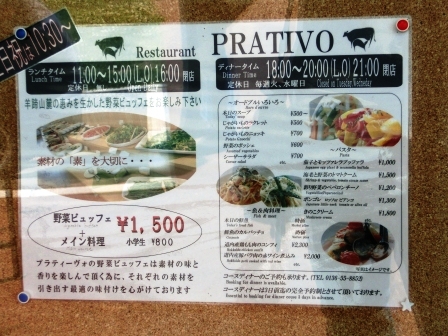 山菜採りの後、夫婦で、野菜食べ放題でヘルシーなレストランとして人気の「PRATIVO プラティーヴォ」へ向かう。噂通りの相変わらずの混雑振りで、12時での待ち時間は40分。その後は50分待ちになっていた。メニューは、メイン料理としての鶏モモ肉の軽い煮込とクリームソースにパン、ほんのり温かいサーモンのマリネとパセリ、グリーンマスタードソースにパン。または豚挽肉のトマトソースパスタかしらすとゴボウの和風パスタの4品から1品を選び、サイドメニューは野菜ビュッフェ。これで一人1,500円。私たちはメインに鶏モモ肉とサーモンを選択。野菜ビュッフェでは今が旬の茹でグリーンアスパラの他、ジャガイモのグラタン、なす揚げの煮浸し、その他、いろいろ。各種野菜のピクルスも美味しかった。味は全体に薄味?高橋牧場の飲むヨーグルトも美味。デザートではプリンにカステラを食べ、最後にコーヒーで締めて、ヘルシーさにも満足。ただ、個人的な感想では、同じ野菜中心でのヘルシーバイキングならば「くるるの杜」が上位にランクされるかな?