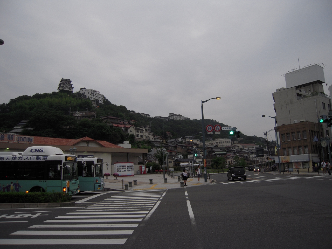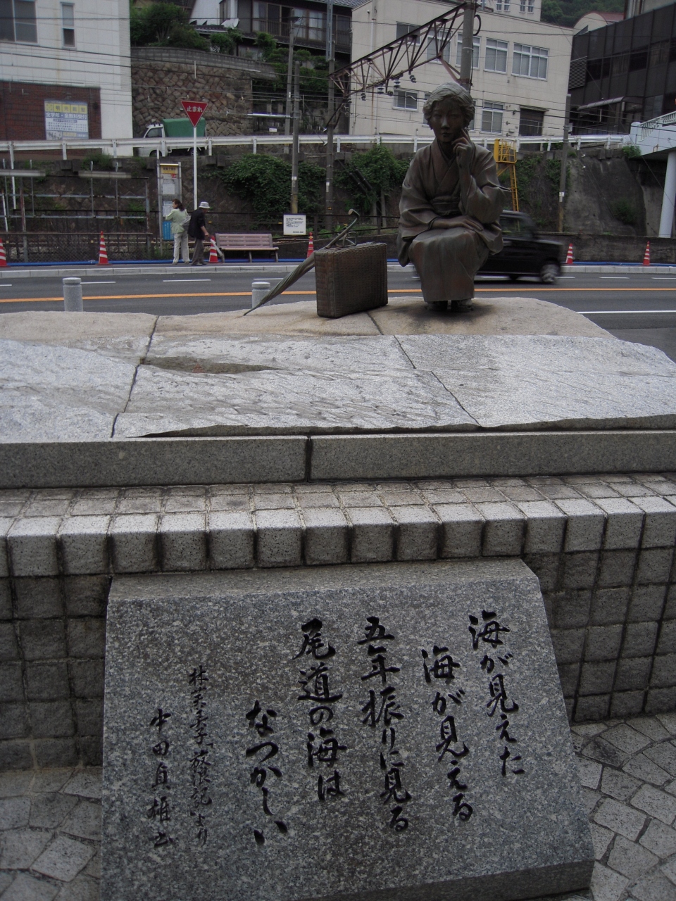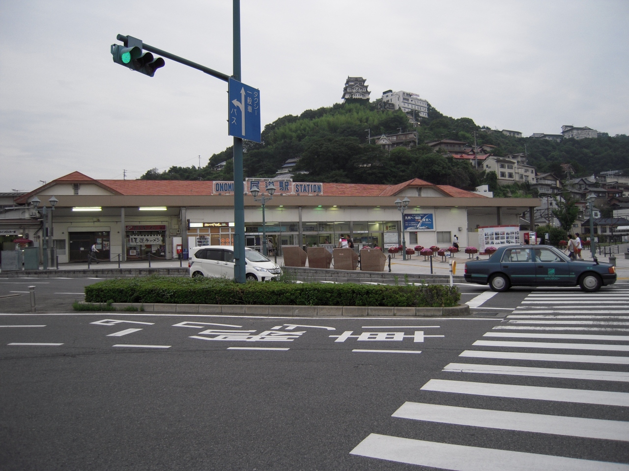 可愛らしい駅舎は海のそばで島に行くには便利だが、反対側はすぐ山