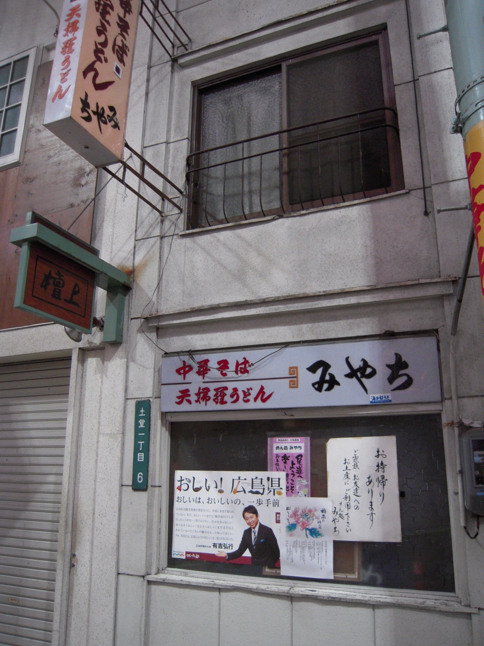 尾道駅の西から:みやち(6時半で閉店)、壱番館(7時閉店)、つたふじ、朱華園と4候補を調べておいた。