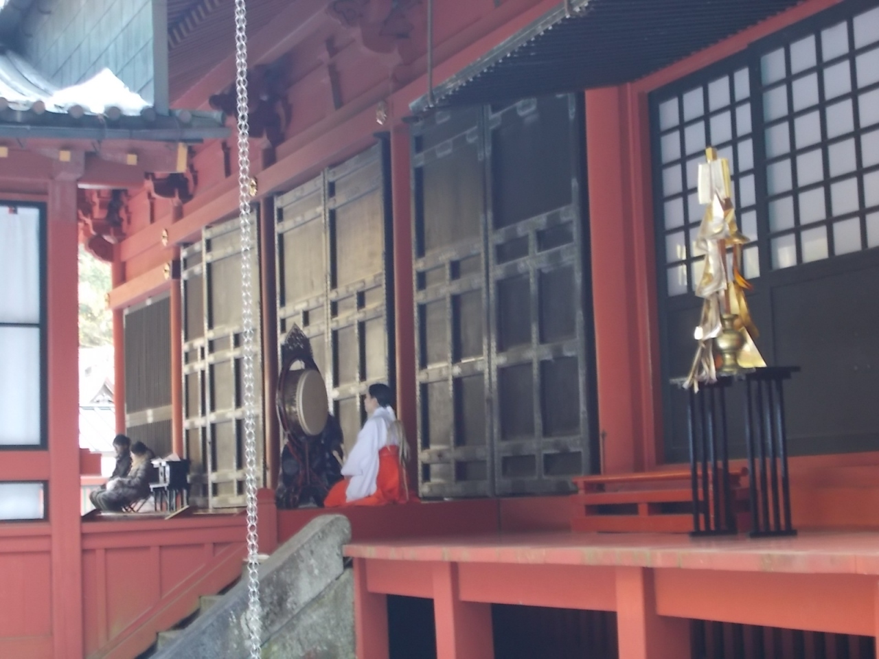 透塀こしに垣間見える本殿、華やかな装飾があるようですが、拝観エリアでないので、ご縁が無いと拝見出来ないのが残念です。1月12日に訪ねた時には、本殿で結婚式がされていました。
