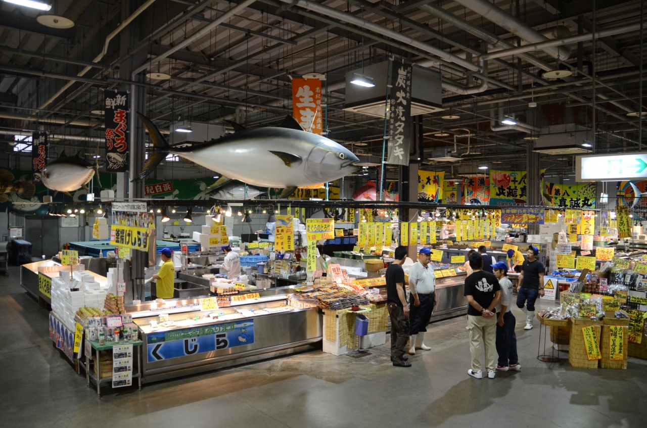 広々した綺麗な市場で新鮮な魚介類がたくさん売られています。バーベキュー用のセットなども売られていました。他にも地域のお土産屋さん、飲食店もあり買い物も楽しむことができます。とれとれの湯と同じ区画の駐車場なのでそのままお風呂に行くことも可能です。