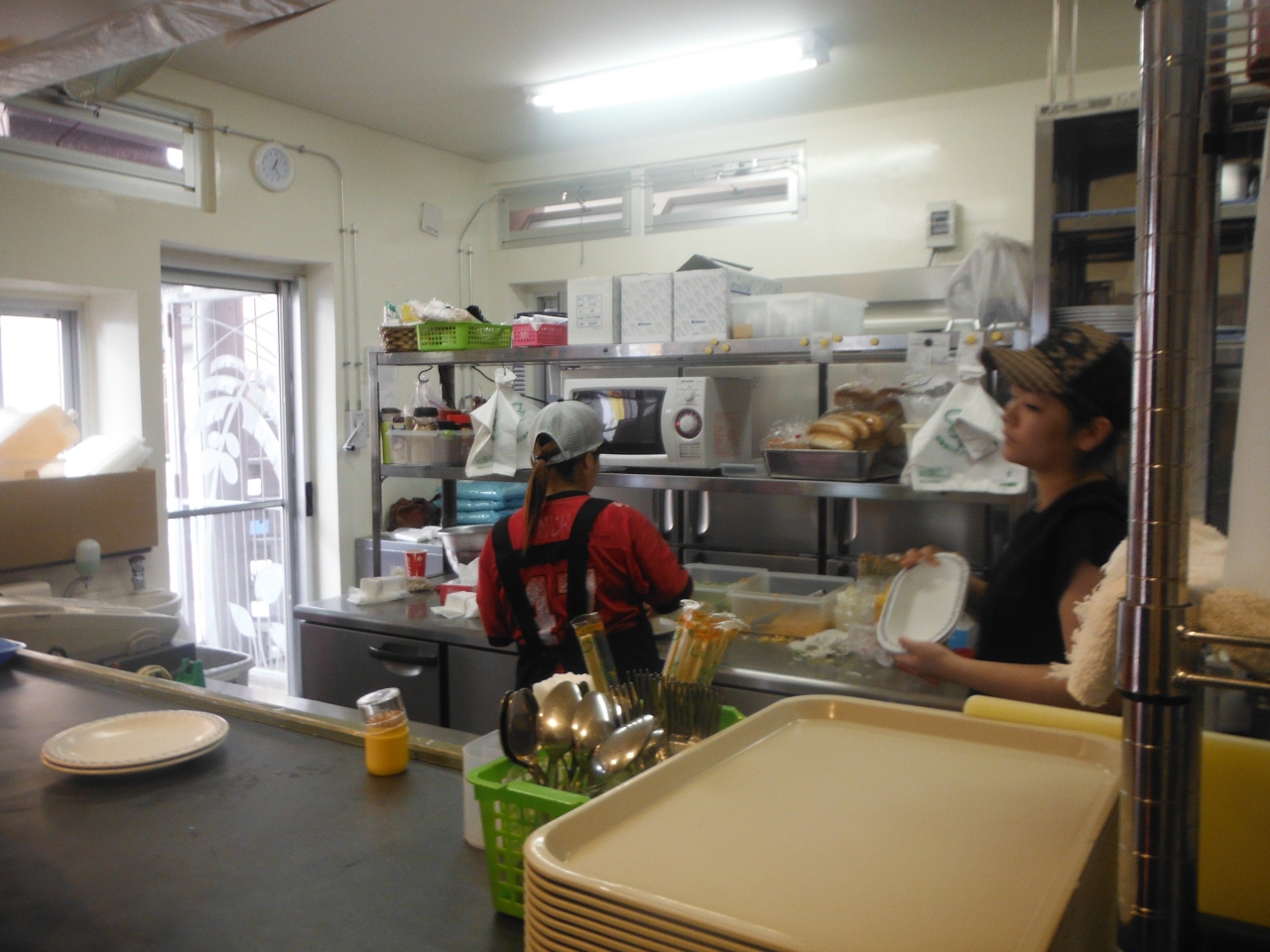 前日に泡盛を飲み過ぎて二日酔いの主人は車で寝ている最中に、娘2人と食べに入りました。ランチ時間よりも早くに着きましたが、既に店内は満席!ってよりも、お店の外まで人が並ぶ状態!順番待って「タコライスチーズ:\500」と「ハンバーガー:\300」を注文した。のに、横から娘が「ポテトフライ(\300)も!」と追加した。