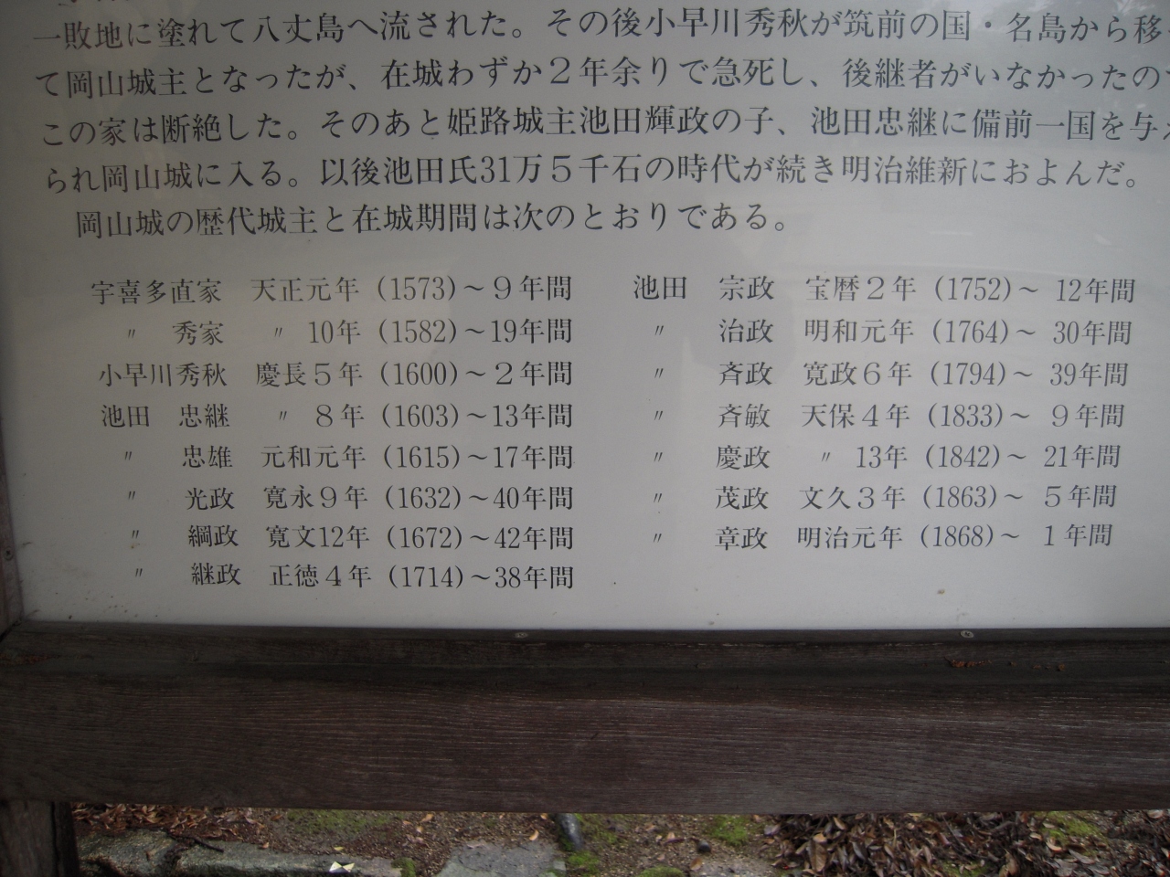 岡山城主の宇喜多から、小早川、現在の池田 厚子(昭和天皇の皇女)様につながる経緯がよくわかった。
