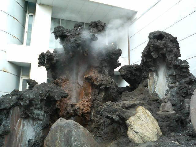 ビルの前に温泉の源泉を思わせる岩場があり、そこから湯気が立ちこめていて、温泉街の風情が感じられます。