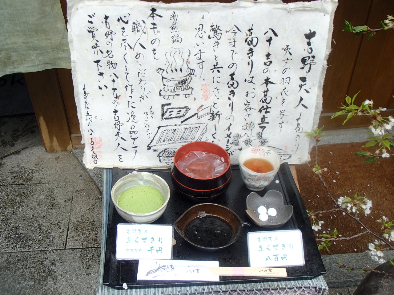 吉野葛 八十吉 (ヨシノクズヤソキチ) のは、創業、嘉永四年で、葛の元祖として有名です。ここでは、本くずきりを食べる事ができます。 本くずきりを堪能でき、抹茶とのセットがおすすめです。ぜひ、一度、立ち寄ってみてください