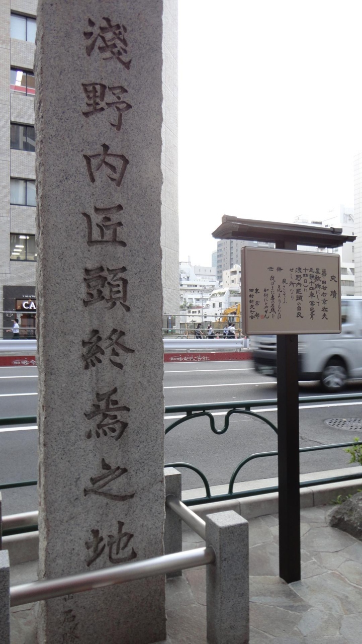日比谷通りを歩いていて、忠臣蔵でお馴染みの浅野内匠頭にまつわる石碑を見かけました。この地にあった屋敷で自決したとのこと。