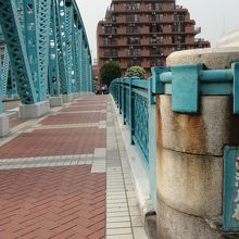 水色の橋とレンガ色の歩行者用通路が特徴的なのと、あと橋の袂に大きなオブジェが設置されていたのが印象的でした。