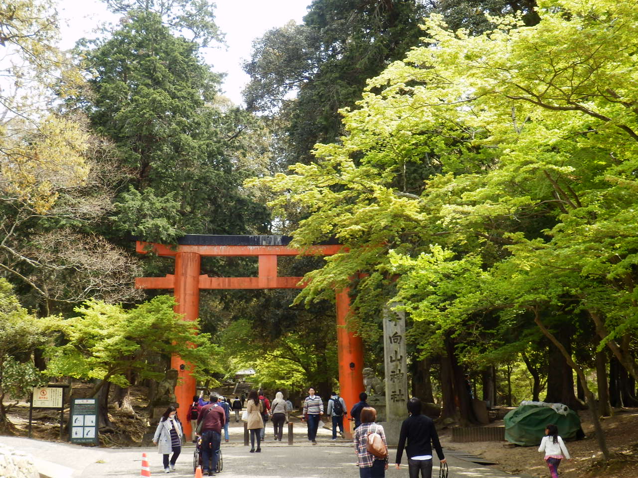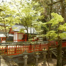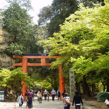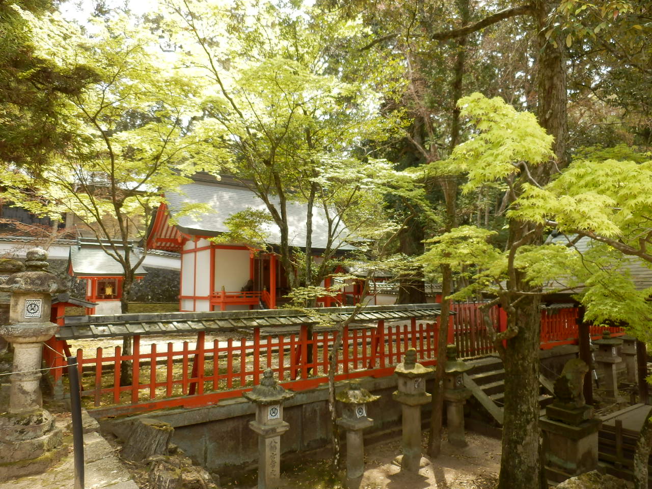 若草山の北側にある神社ですが、東大寺の大仏殿から東へ進むと、大きな赤い鳥居があるので分かりやすいです。若草山や三月堂の近くにも石造りの鳥居がありました。境内はそれほど広くないですが、私が訪れたときは新緑が美しく、真っ赤な建物と緑が調和していました。