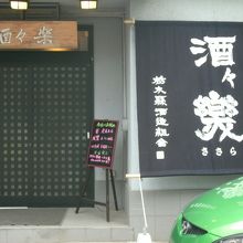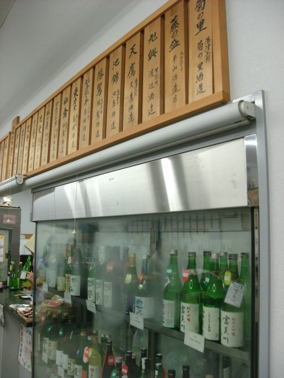 なんじゃココ!・・あらら居酒屋じゃない。看板「酒々楽(ささら)」、テーブル席でちょびちょびやってるではありませんか。ショーケースには日本酒のビンがわんさか置いてある。銘柄札が掲げてある。