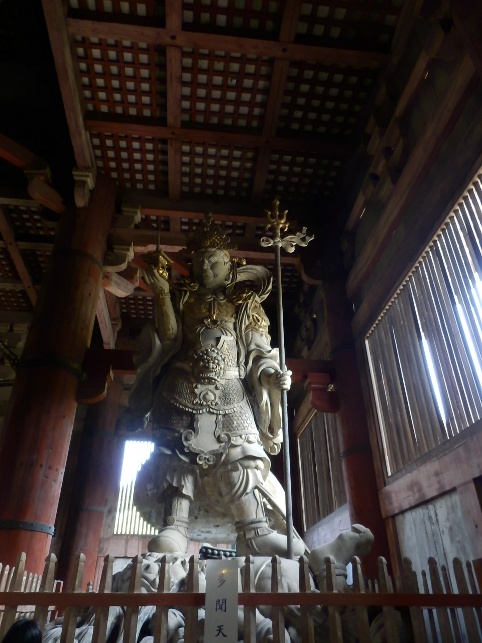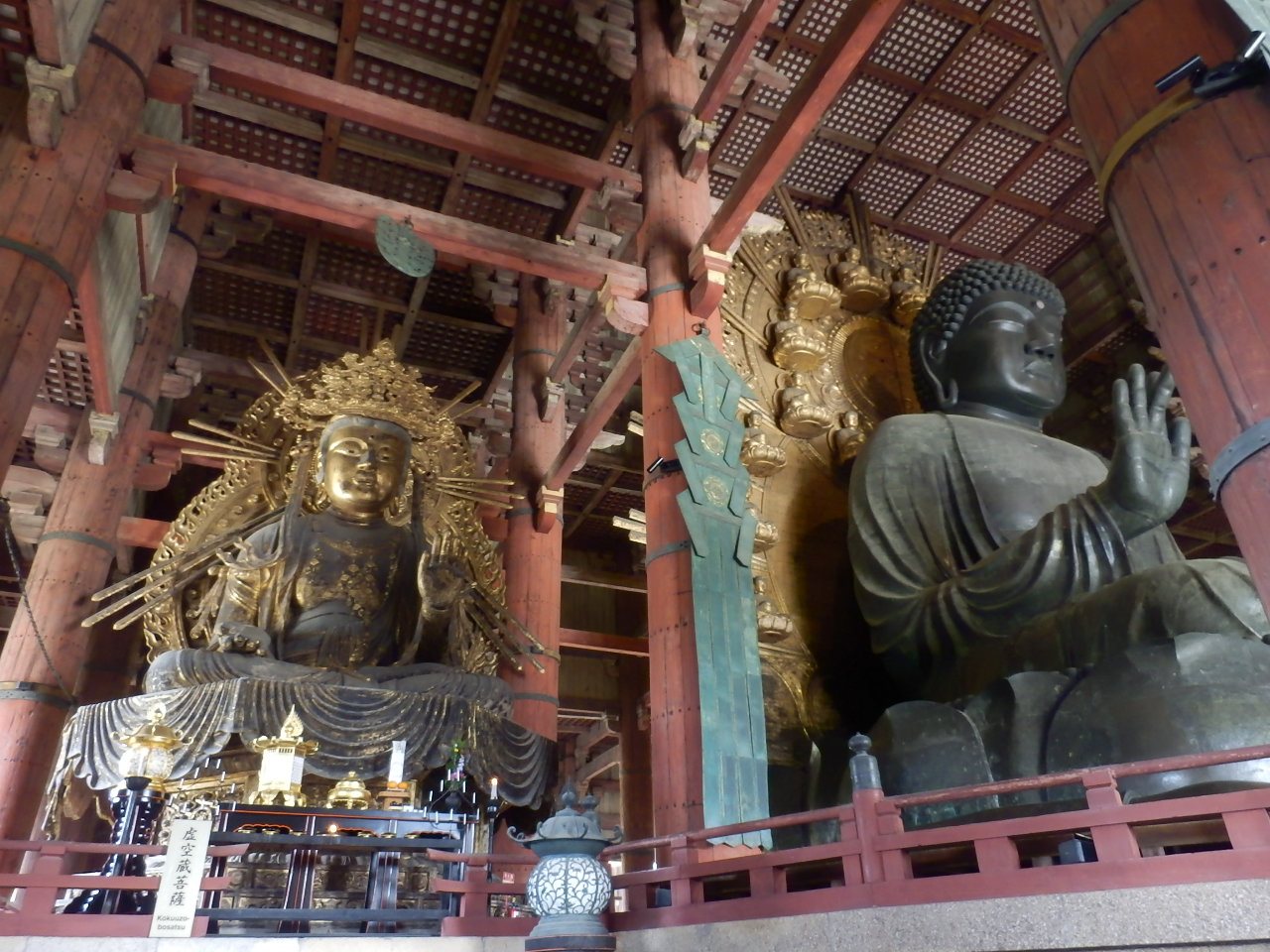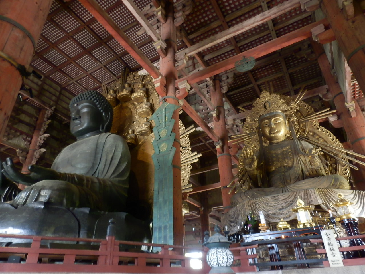 東大寺と言えば大きな大仏なので、大仏を目当てに訪れたら、大仏以外にも見どころが多かったです。大仏殿の前の広場は美しく庭園が整備されていましたし、巨大な大仏殿の建物も素敵でした。大仏殿の中に入ると、中央に大仏がいましたが、その両サイドには木造の美しい仏像が2体あり、その裏手にも仁王像のような像が二体置かれていて、見どころが多かったです。