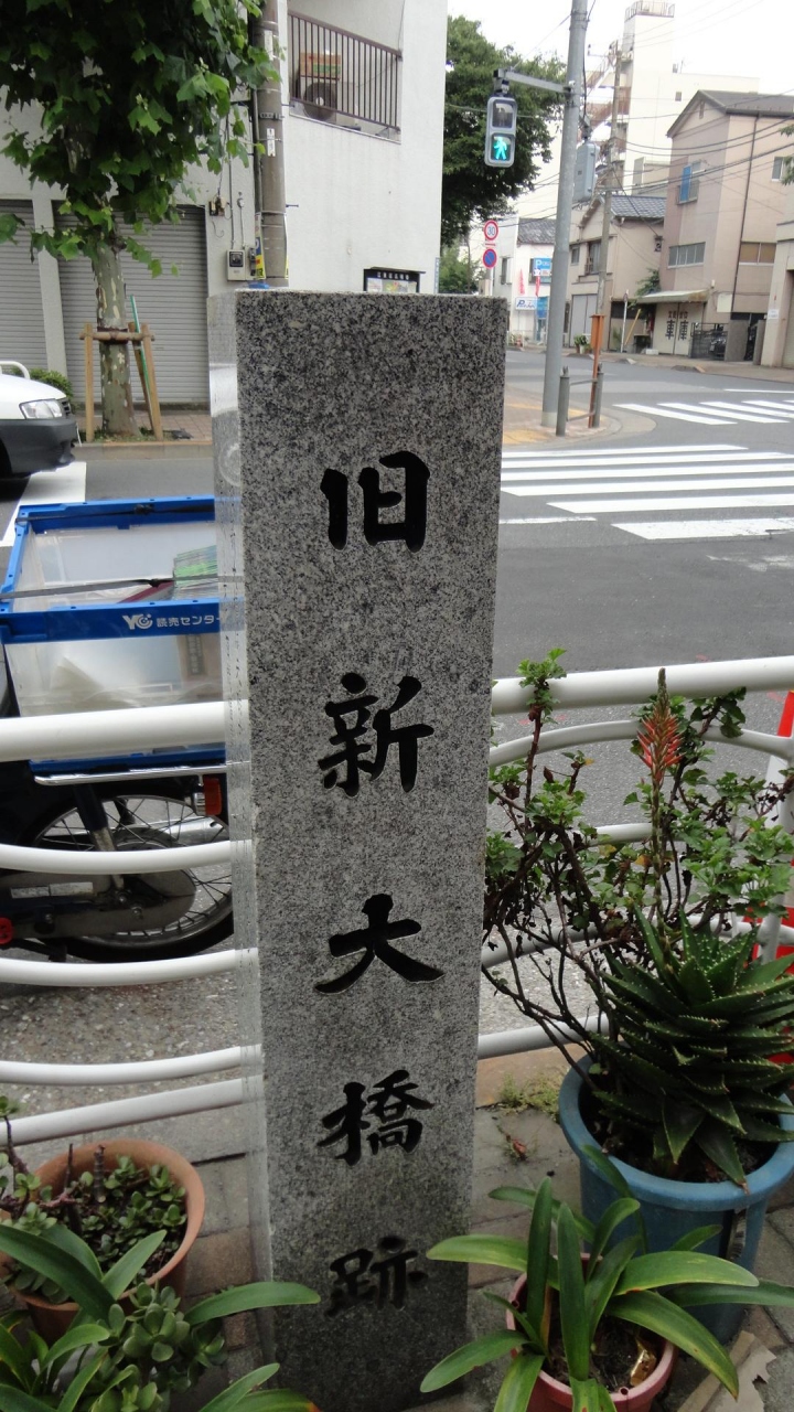 清澄庭園をあとにし、万年橋通りを北に進んで行くと、芭蕉稲荷神社の先に「旧新大橋跡」の石碑を見つけました。