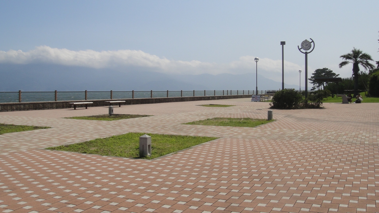 御用邸記念公園の近くにあるプロムナードの公園です。無料の駐車場があるので、車を停めたらゆっくりと海を眺めながら散歩できます。トイレもあります。そばの海岸はウインドサーフィンを楽しむ人でにぎわっていて、その向こうには松林と象山の風景が見えます。プロムナードは途中から牛伏山を上がるコースもあって、少し高いところから海を見渡すことができます。潮風が心地よく、気持ちよく散歩できる公園です。開園時間が決まっていて、夕方になると出入口が閉まるのでチェックが必要です。