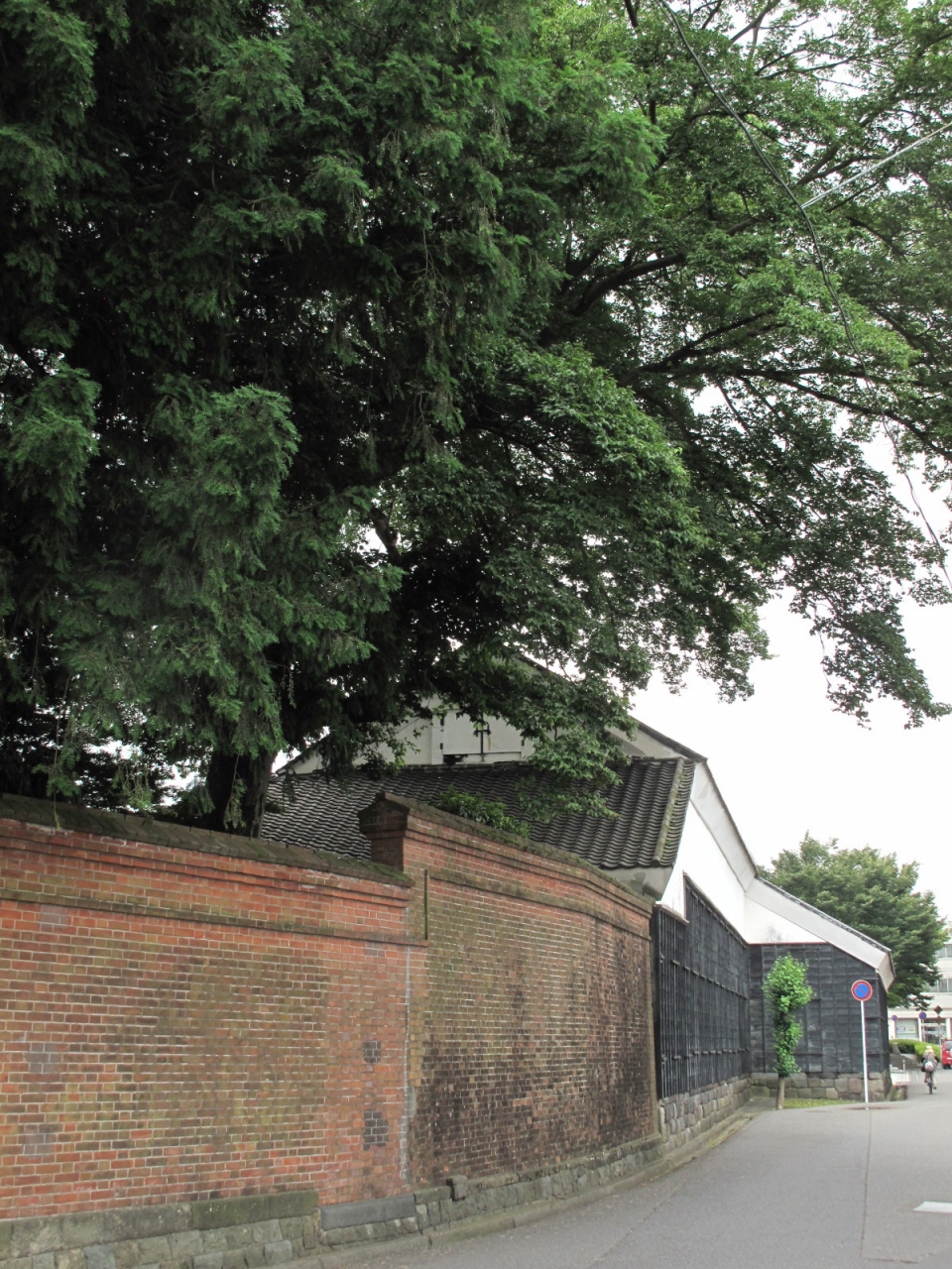 仲町の歴史の建物を見ながら進み、左手の道の向こうにキッコーマンの醤油蔵が見えます。こちらの醤油蔵は、歴史を感じるもので、路地を進むと黒塗りの土蔵も緑の中に建っており、とても風格を感じられます。