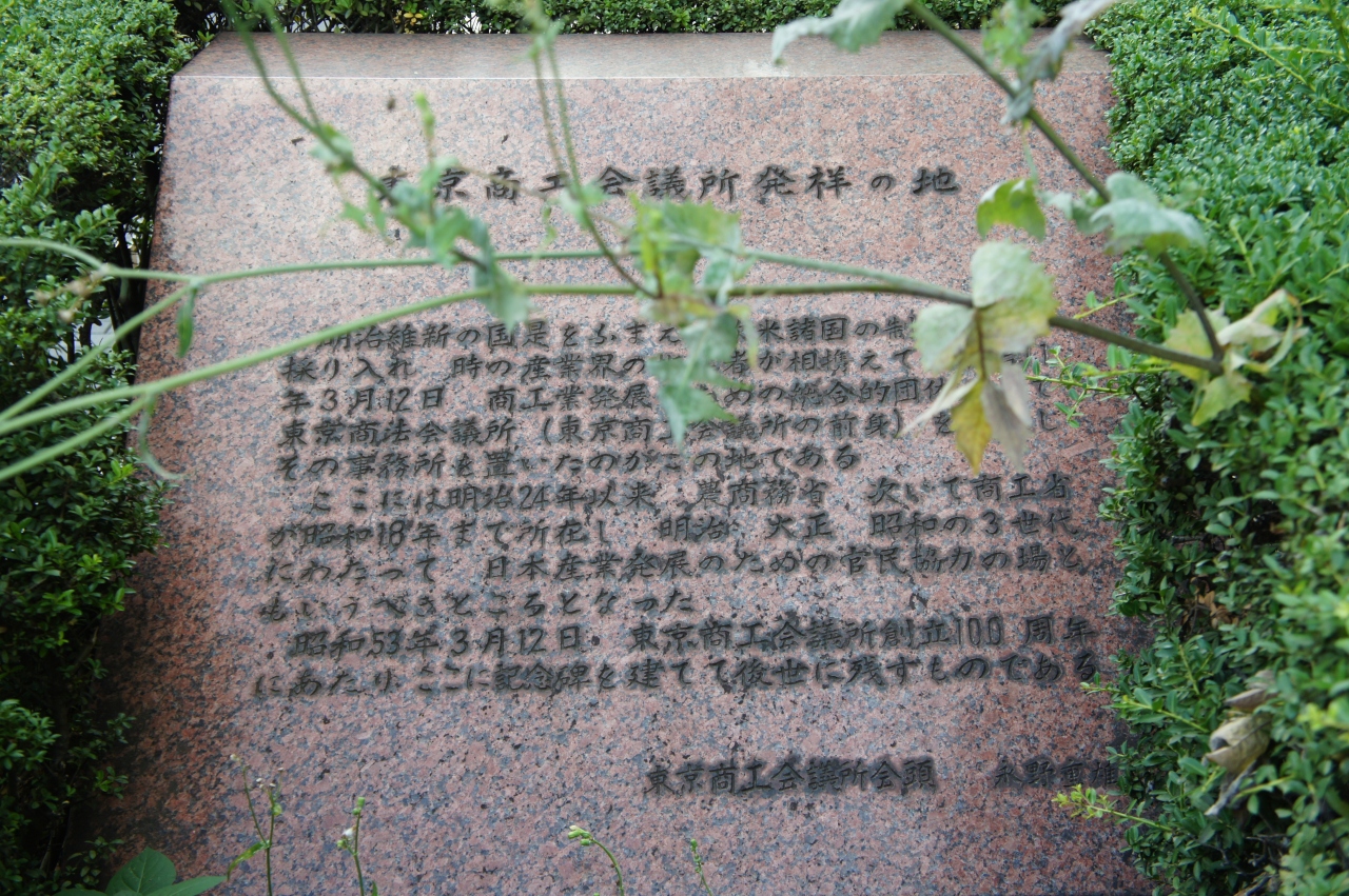 東京商工会議所発祥の地の碑は、日産自動車の本社ビルの傍ら。といっても非常に分かり辛い場所。植え込みにうず埋もれるようにあって、普段この辺りを行き来する人でもまず気が付く人はいないかもしれません。
