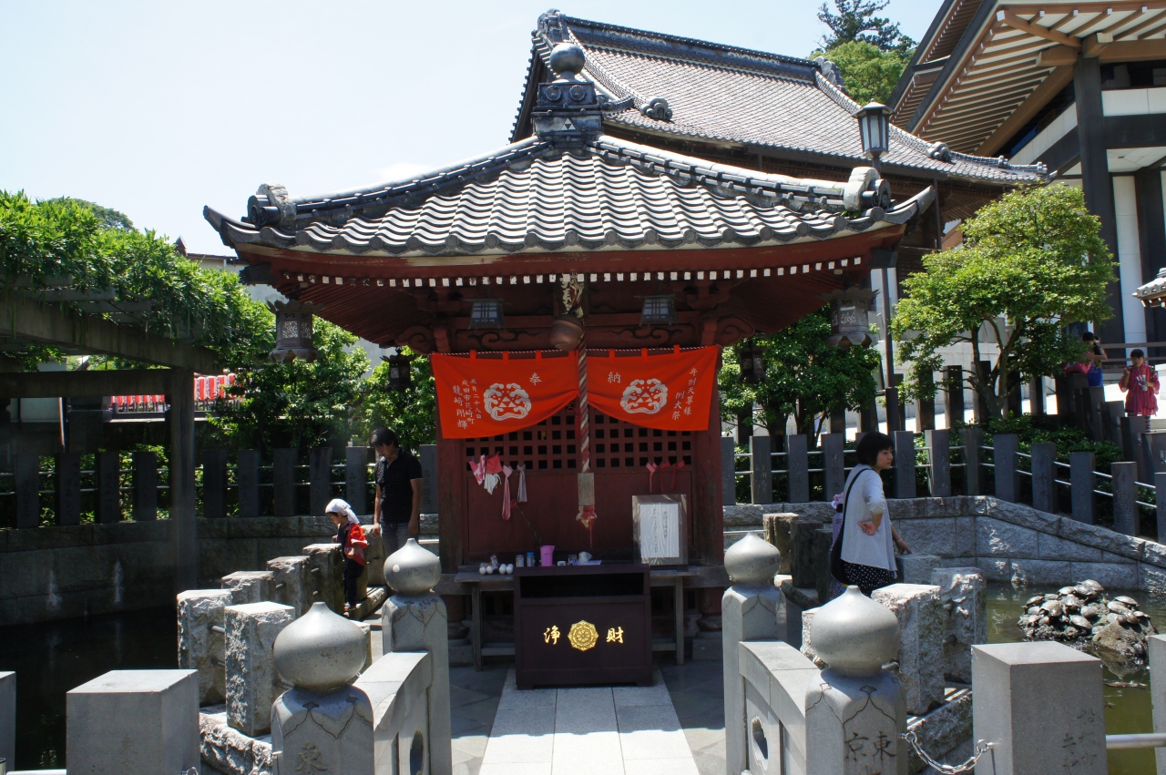弁財天堂は総門の脇。芸能の神でもあり、水の神でもある弁財天をお祀りする御堂で、説明によれば、新勝寺の建物の中でも最も古い建物の一つだそうです。赤いお堂の周囲は池が囲んでいて、ちょっと静かな一角となっています。