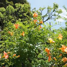 新勝寺の右手奥から成田山公園に登って行くと、まずあるのが梅園。遊歩道の両脇に続いているのですが、初夏の時期には青い葉っぱだけ。代わりに色を添えていたのはノウゼンカズラでした。濃い緑の中に赤い花が鮮やかで、なかなかにいい眺めでした。